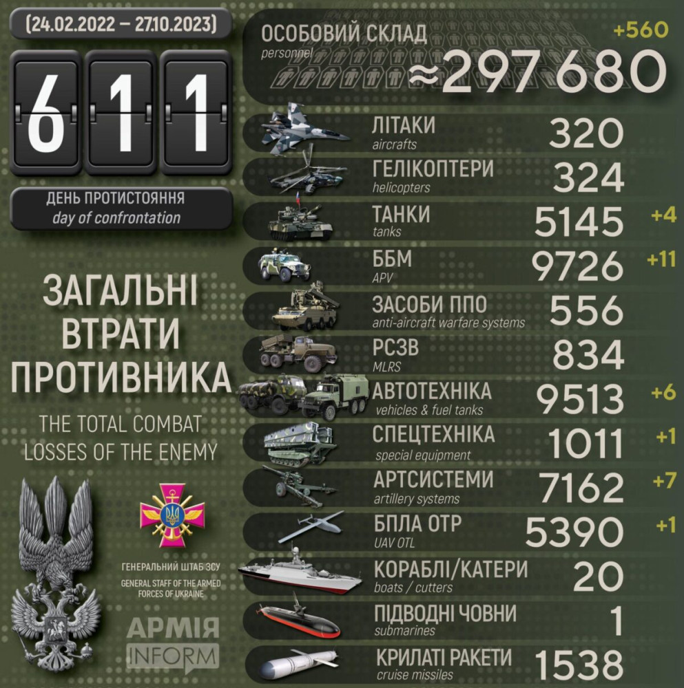 Крім того, за даними Генерального штабу Збройних сил України, наші захисники також знищили 11 бойових броньованих машин, один БПЛА оперативно-тактичного рівня, шість одиниць автомобільної техніки і одну одиницю спецтехніки.
