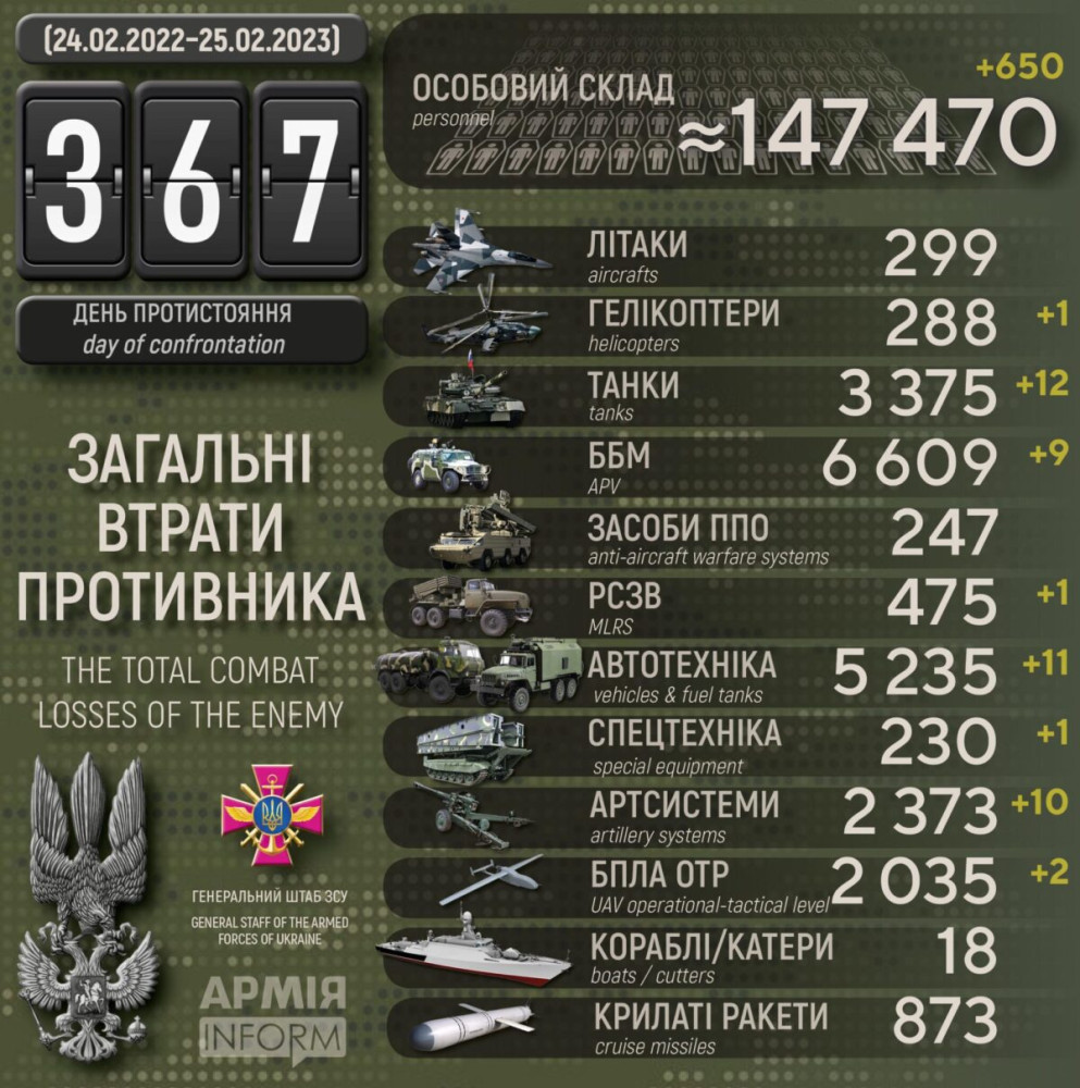 Сили оборони за добу знищили ворожий гелікоптер, 12 танків і 650 окупантів650 осіб, один гелікоптер і 12 танків втратили окупанти в Україні за минулу добу. Крім того, за даними Генерального штабу Збройних сил України, наші захисники також знищили дев'ять бойових броньованих машин, десять артсистем, одну РСЗВ, два БПЛА оперативно-тактичного рівня, 11 одиниць автомобільної техніки і одну одиницю спецтехніки. Усього з початку повномасштабного вторгнення втрати ворога склали: особового складу — 147 470 осіб; танків ‒ 3375 одиниць; бойових броньованих машин ‒ 6609 одиниць; артилерійських систем – 2373 одиниці; РСЗВ – 475 одиниць; засоби ППО ‒ 247 одиниць; літаків – 299 одиниць; гелікоптерів – 288 одиниць; БПЛА оперативно-тактичного рівня – 2035; крилаті ракети ‒ 873; кораблі /катери ‒ 18 одиниць; автомобільної техніки та автоцистерн – 5235 одиниць; спеціальна техніка ‒ 230. СМЕРТЬ РОСІЙСЬКИМ ОКУПАНТАМ! Помітили помилку? Виділяйте слова з помилкою та натискайте control-enter |