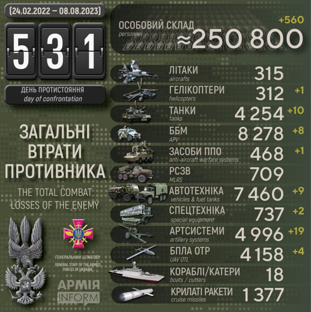 Сили оборони за добу знищили ворожий гелікоптер, 19 артсистем і майже 600 окупантів560 осіб, десять танків і гелікоптер втратили окупанти в Україні за минулу добу. Крім того, за даними Генерального штабу Збройних сил України, наші захисники також знищили вісім бойових броньованих машин, 19 артсистем, один засіб ППО, чотири БПЛА оперативно-тактичного рівня, дев'ять одиниць автомобільної техніки і дві одиниці спецтехніки. особового складу — 250 800 осіб; танків ‒ 4254 одиниці; бойових броньованих машин ‒ 8278 одиниць; артилерійських систем – 4996 одиниць; РСЗВ – 709 одиниць; засоби ППО ‒ 468 одиниць; літаків – 315 одиниць; гелікоптерів – 312 одиниць; БПЛА оперативно-тактичного рівня – 4158; крилаті ракети ‒ 1377; кораблі /катери ‒ 18 одиниць; автомобільної техніки та автоцистерн – 7460 одиниць; спеціальна техніка ‒ 737. СМЕРТЬ РОСІЙСЬКИМ ОКУПАНТАМ! Помітили помилку? Виділяйте слова з помилкою та натискайте control-enter |