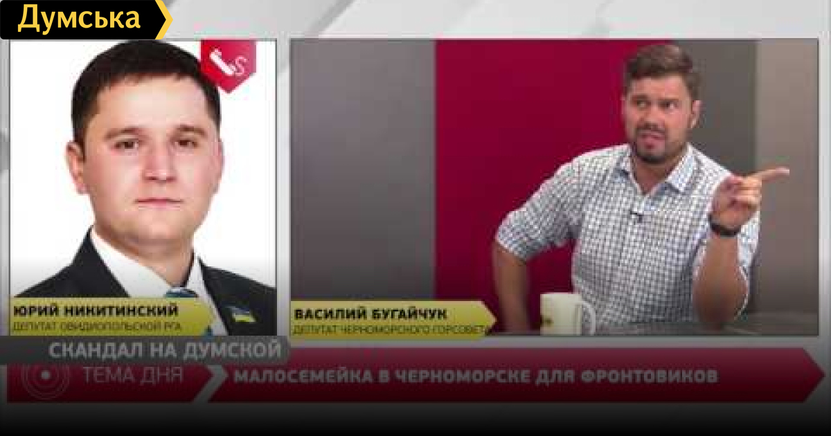 В студии «Думской ТиВи» возникла перепалка между депутатом Черноморского горсовета Василием Бугайчуком и депутатом Овидиопольской райадминистрации Юрием Никитинским. Начав диалог с социального жилья, они закончили обвинениями в сепаратизме.