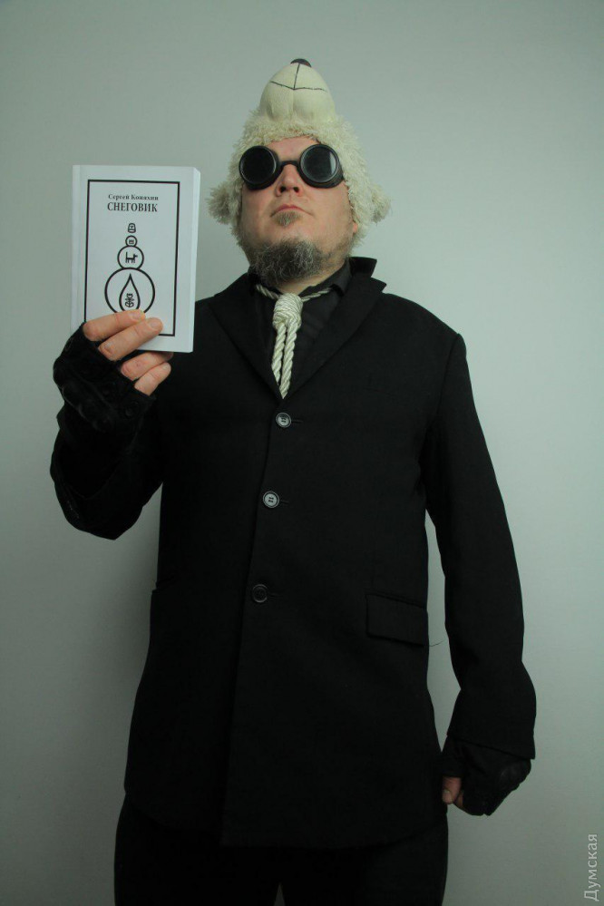 Сказание о безумном снеговике: книга одесского автора оказывает разрушительное воздействие на мозг!Одесский мастер трэша Сергей Коняхин написал повесть. Она называется «Снеговик». Работой молодого и подающего надежды автора заинтересовался специальный корреспондент «Думской» Дмитрий Жогов и едва не поплатился за это рассудком. Слово ему. Мне кажется, что к книгам нужно прилагать инструкции, как к лекарствам, где обязательно будет раздел «побочные эффекты». Я прочел больше половины свежеизданного романа Сергея Коняхина «Снеговик» и…сомлел. Как писал небезызвестный Г. Климов, у меня случился «мозговой разжиж». Такое бывает, если неподготовленный человек сдуру пошел на выставку современного искусства или, в жизни ничего не куривший, попробовал «дунуть» косяк с пакистанским гашишем. Тут же постигнет храбреца тошнота, томление духа и деградация, вплоть до неразличения сексуального объекта и кататонического ступора. Вот и меня постигли все эти «побочки». Сергей Коняхин — он и режиссер, и оператор (т.е. режопер по-киношному), и сценарист трэш-фильмов (буквальный перевод «мусорные фильмы», про них мы рассказывали) — выпустил свой многолетний труд. Повесть называется «Снеговик» с подзаголовком: «Снеговик. Сказание о безумном снеговике, одержимом древневавилонянским демоном Йог-Соттхотхом». Арт-критик Ута Кильтер, прочитав ее, наверняка выдаст что-то про симулякры и здоровое скоморошество, оксюморон, замешанный на болезненном лавкрафтианстве. Я же человек простой, ознакомившись с работой Коняхина, почувствовал, что схожу с ума. Говоря по-простому, это роман о снеговике убийце, который всех встречных-поперечных пронзает своей морковкой. И он ищет лето. Несмотря на обилие персонажей, повествование довольно складное и подчинено своей безумной логике. Помните, в фильме «Игры Разума» у страдающего конспирологией шизофреника на стенах секретной комнаты были фотографии, статьи из газет, склеенные красными нитями. Он обнаруживал тайный смысл в объявлениях и газетных новостях, которые складывались в единую картину. Вот и тут в одно целое вплелись снеговики, Дед Мороз, Вавилон, Электричка и тоска по лету, и все это хорошенько припорошено снегом. Дочитав до 13 главы: «Представая перед каким-либо человеком, снеговик никогда не оставлял свидетелей и на всякий случай выкалывал глаза, оставляя в теле морковку спереди или на спине, и не был замечен. Правда, он иногда сажал морковку в самую макушку. И тогда они выглядели, как Чиполлино, с веточками на голове. Морковки пускали в них корни, и мертвые залезали на крыши, чтобы сосать сосульки, падать и разбиваться о бесконечный, как лето, лед», — я почувствовал, что у меня ум за разум заходит. Обратился к автору за разъяснениями. - Я прочел большую часть книги и почувствовал, что схожу с ума. Что делать? Сергей Коняхин в черных очках, с медведем на голове, ответил: - Любая книга в первую очередь, с моей точки зрения, призвана вызвать определенное изменение сознания в той или иной области. Так что, образно выражаясь, если вы прочли полкниги и ваше сознание ничего не получило, то книгу надо отложить и взять другую. Некоторые книги изменяют не только сознание, но и жизнь их прочитавших людей. Мне, к моему счастью, попалось даже несколько таких. Лучшие книги вызывали особенно сложнейшие душевные переживания и