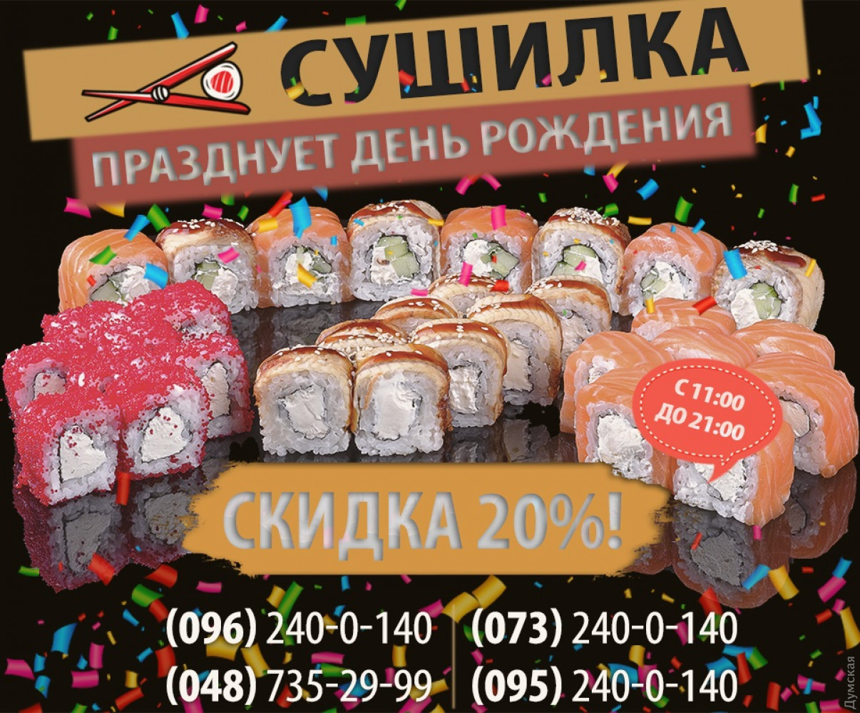 15 августа сервис доставки еды «Сушилка» празднует свою первую годовщину! Ровно год назад тогда еще служба доставки роллов и суши «Сушилка» выполнила первый заказ. Сервис не стоял на месте и регулярно пополнял, расширял и совершенствовал доступный выбор блюд. Так, вскоре после начала работы число доступных на выбор роллов увеличилось почти вдвое, а также был дан старт работе WOK-цеха. Впоследствии было решено расширить ассортимент онлайн-ресторана, добавив два десятка разнообразных пицц в самых смелых сочетаниях и композициях. Примечательно, что изначально «Сушилка» не шла по легкому пути и пыталась добиться аутентичного вкуса для этого блюда, потому было отдано предпочтение настоящей дровяной, а не электропечи. По случаю праздника сервис дарит 20% скидку 15 августа 2018 года в период с 11:00 до 21:00. Заказы будут принимать до 21:00. Заказ можно сделать на сайте sushilka.od.ua или по телефонам: 073-240-0-140 (Lifecell); 095-240-0-140 (Vodafone); 096-240-0-140 (Kyivstar); 048-735-29-99 (городской). СМЕРТЬ РОСІЙСЬКИМ ОКУПАНТАМ! Помітили помилку? Виділяйте слова з помилкою та натискайте control-enter |
