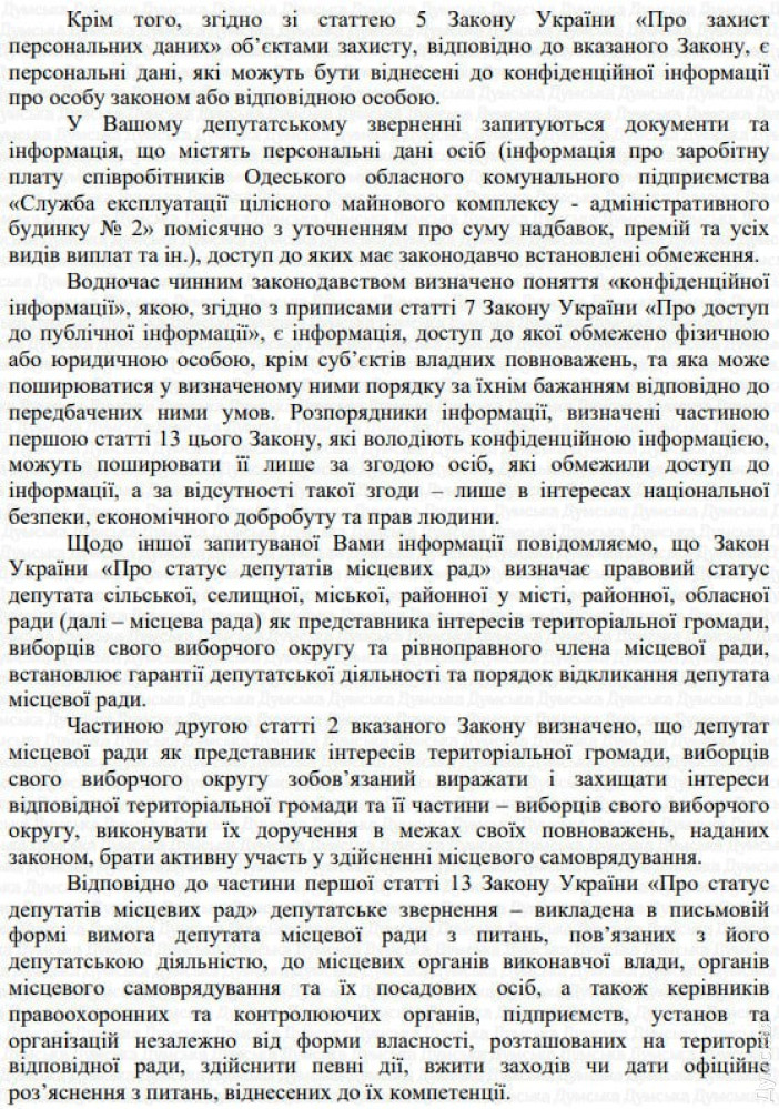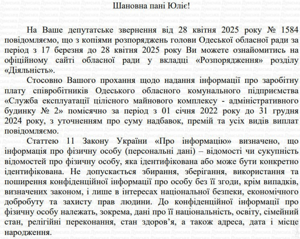 Вона наполягає, що облрада продовжує приховувати копії розпоряджень голови Одеської ради, головного «слуги» регіону Григорія Діденка. Крім того, як виявилося, секрет, скільки отримують працівники КП «Адмінбуд №2» (ті самі, що сидять в «скляшці» на Канатній, 83), і які там премії під час війни? Ще одна таємниця за сімома печатками — де звіти про їхню роботу за 2022, 2023 і 2024 роки.