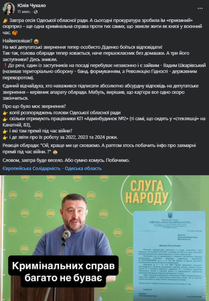 «Завтра сесія Одеської обласної ради. А сьогодні прокуратура зробила їм (голові Григорію Діденку та його однодумцям, — Ред.) «приємний» сюрприз — ще одну кримінальну справу проти тих самих, хто звик жити, як князі у воєнний час», — написала Чухало.