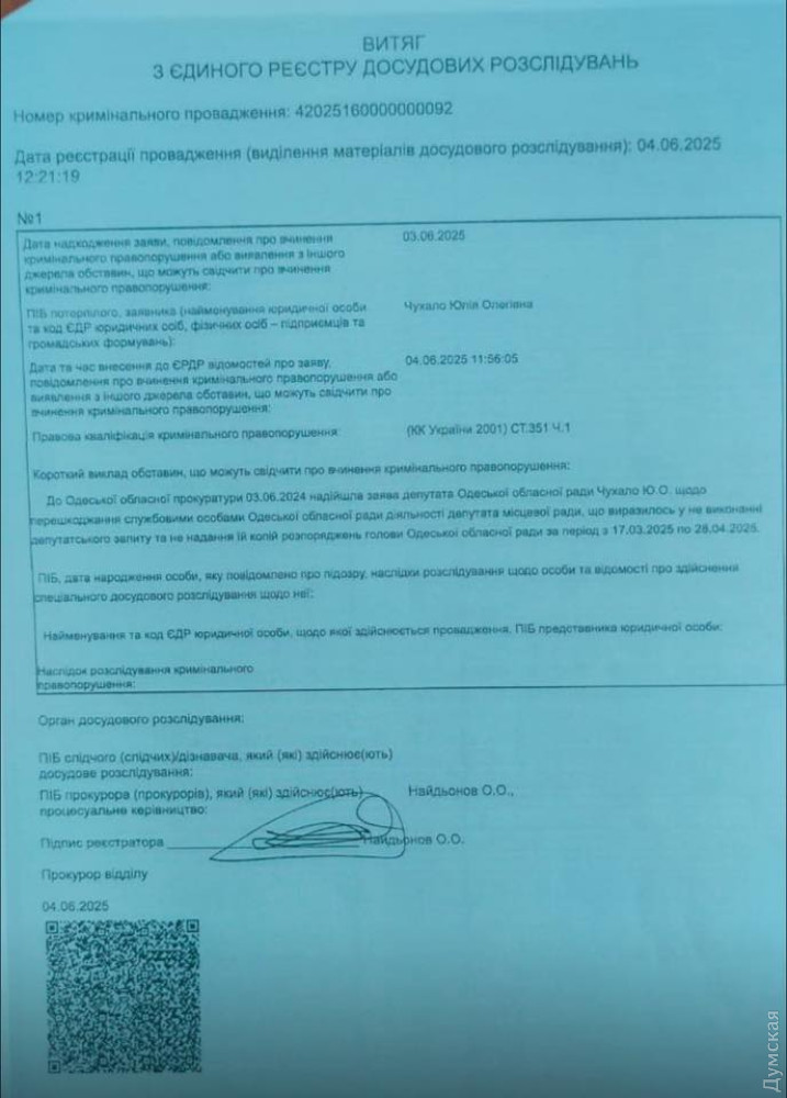Стосовно співробітників Одеської облради, які перешкоджають діяльності депутатки «ЄС» Юлії Чухало, розпочали досудове розслідування.
