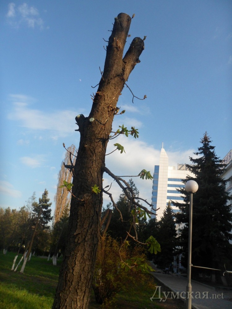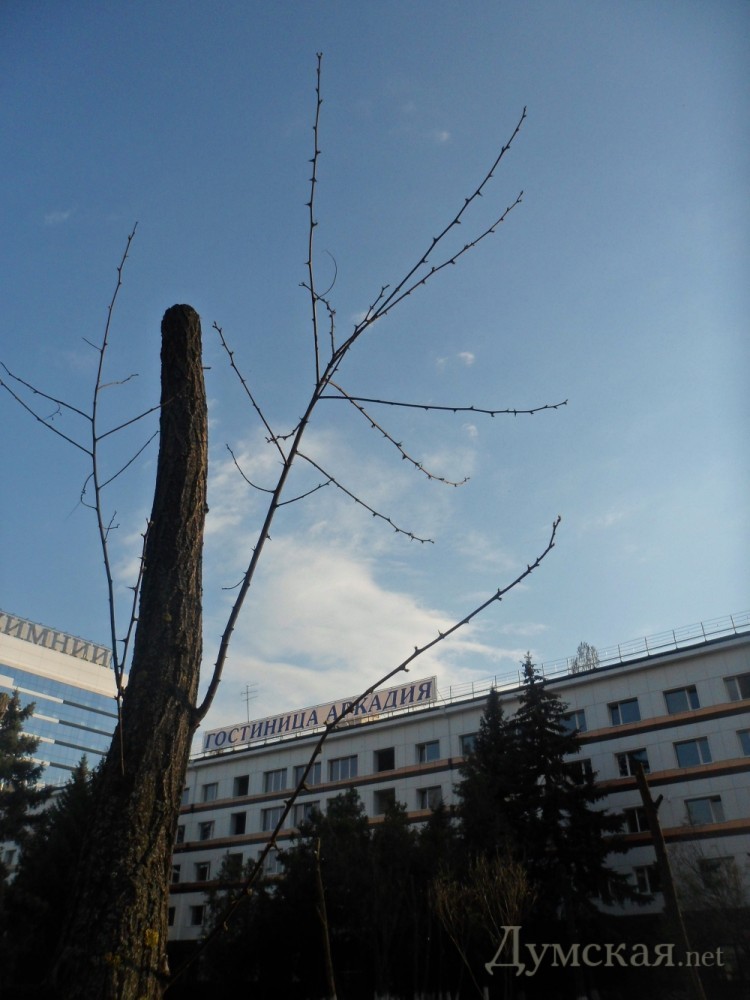 Правда, из 78-ми деревьев, варварски «подрезанных» по приказу администрации отеля «Аркадия», признаки жизни проявляют меньше половины, а на одном молодые веточки засохли, так и не распустившись.