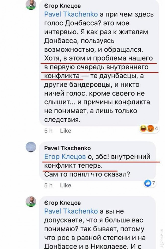 «Слуги народа» выдвинули на выборы в Николаеве пособника «ДНР», который внесен в базу «Миротворца»Президентская партия «Слуга народа» выдвинула на местные выборы в Николаеве Егора Клецова, который поддерживает боевиков «ДНР», внесен в базу «Миротворца» и который считает войну на Донбассе «внутренним конфликтом». Об этом сам кандидат сообщил на своей странице в Фейсбук. «Сегодня я горд представлять партию Слуга Народа! Завтра буду горд представлять город и горожан!« – отметил Клецов. У кандидата от президентской партии богатая биография антиукраинской деятельности, благодаря которой он был внесен в базу сайта «Миротворец». Согласно информации ресурса, в январе 2015 года он участвовал в проведении митингов, направленных на срыв мобилизации в Украине, а также занимался сбором средств на закупку медикаментов для прокремлевских террористов и лично участвовал в их доставке. Не раз Клецов выступал в эфире сепаратистского канала «Новороссия ТВ». Примечательно, что глава избирательного штаба «Слуги народа» в Николаеве бизнесмен Виталий Ким не увидел проблем с выдвижением сепаратиста в качестве кандидата, и написал в соцсетях, что если кому-то не нравится Клецов, он может голосовать за другого кандидата. Фото: ФБ Владимира Горковенко СМЕРТЬ РОССИЙСКИМ ОККУПАНТАМ! Заметили ошибку? Выделяйте слова с ошибкой и нажимайте control-enter |