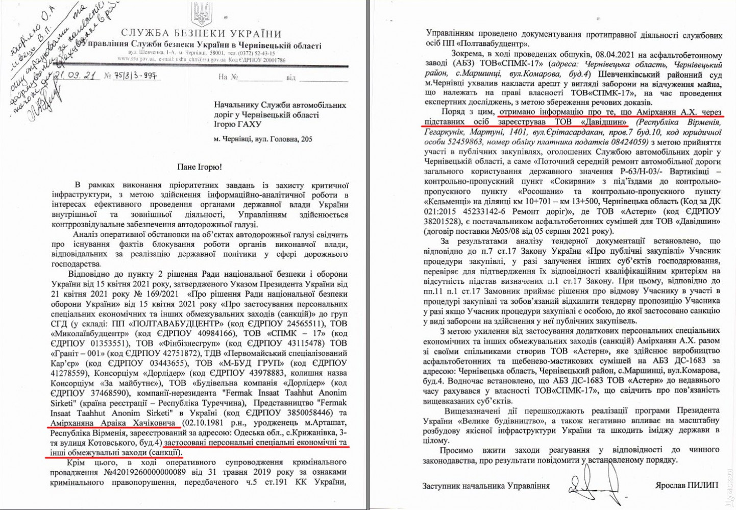 Служба безопасности Украины блокирует дорожные тендеры малоизвестной армянской фирмы: она, возможно, связана с подсанкционным одесским бизнесменомСлужба безопасности Украины считает зарегистрированную в Армении фирму «Давидшин» связанной с одесским предпринимателем Араиком Амирханяном, на которого наложены санкции СНБОУ. Об этом СБУ сообщила в Службу автомобильных дорог в Черновицкой области, в одном из тендеров которой победила эта фирма. Как следует из письма, спецслужба получила информацию о том, что Амирханян через подставных лиц якобы зарегистрировал в Армении фирму «Давидшин», чтобы участвовать в публичных закупках на ремонт автомобильных дорог. Это письмо стало основанием для отмены результатов конкурса по выбору подрядчика ремонта приграничной дороги государственного значения Р-63 в Черновицкой области на сумму 300 миллионов гривен, в котором победила компания из Армении. Напомним, летом этого года, выполняя решение СНБОУ, одесская Служба местных автомобильных дорог расторгла контракты на капитальные ремонты с компаниями из концерна «Дорлидер», который принадлежит Араику Амирханяну. В указе о введении санкции было указано, что Амирханян имеет два гражданства — Украины и Армении. В конце октября фирма «Давидшин» сенсационно выиграла тендер на ремонт дороги Старые Шомполы — Доброслав — Кордон — Пшенянове, что в Лиманском районе Одесской области. Армянский подрядчик предложил минимальную цену, 101 миллион гривен, и опередил фаворита — ООО «Ростдорстрой», которое связывают с окружением одесского мэра Геннадия Труханова. Торги закончились 20 октября. С тех пор прошло уже двадцать дней, однако победитель пока не объявлен. По всей видимости, Служба безопасности Украины направила аналогичное письмо и в Одессу, и сейчас дорожники решают, можно ли считать это основанием для снятия «Давидшин» с торгов. Если это произойдет и армянскую фирму отстранят от конкурса, победителем должны объявить ООО «БерезовкаАгроДорСтрой». Эта фирма принадлежит депутату областного совета от ОПЗЖ Князю Хачатряну. СМЕРТЬ РОСІЙСЬКИМ ОКУПАНТАМ! Помітили помилку? Виділяйте слова з помилкою та натискайте control-enter |