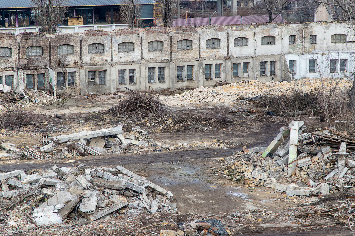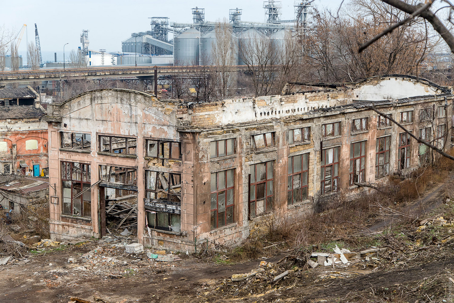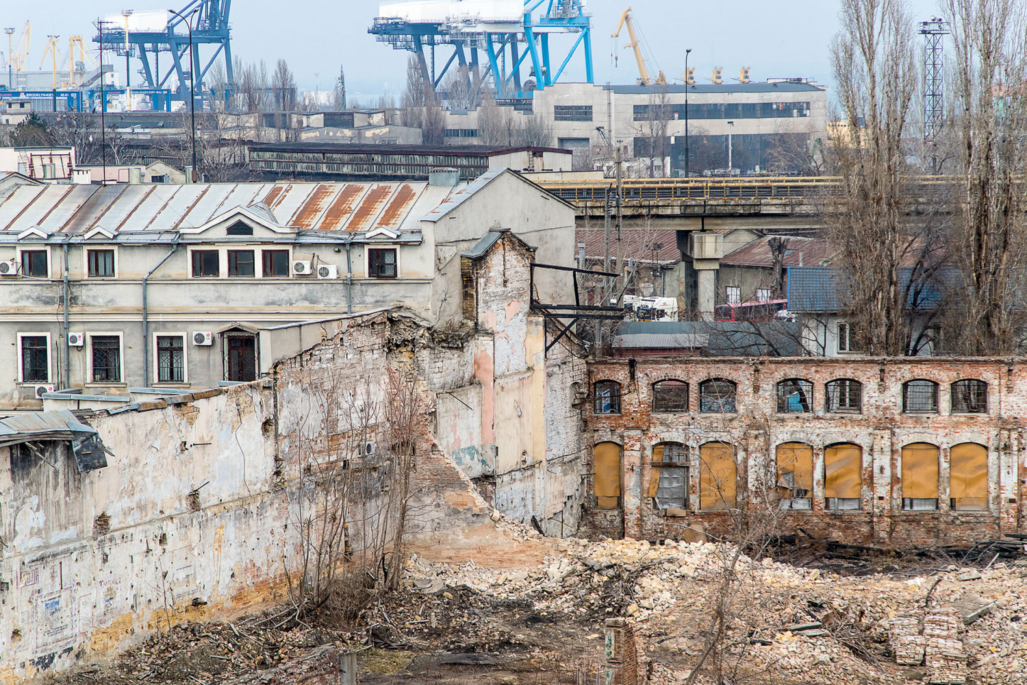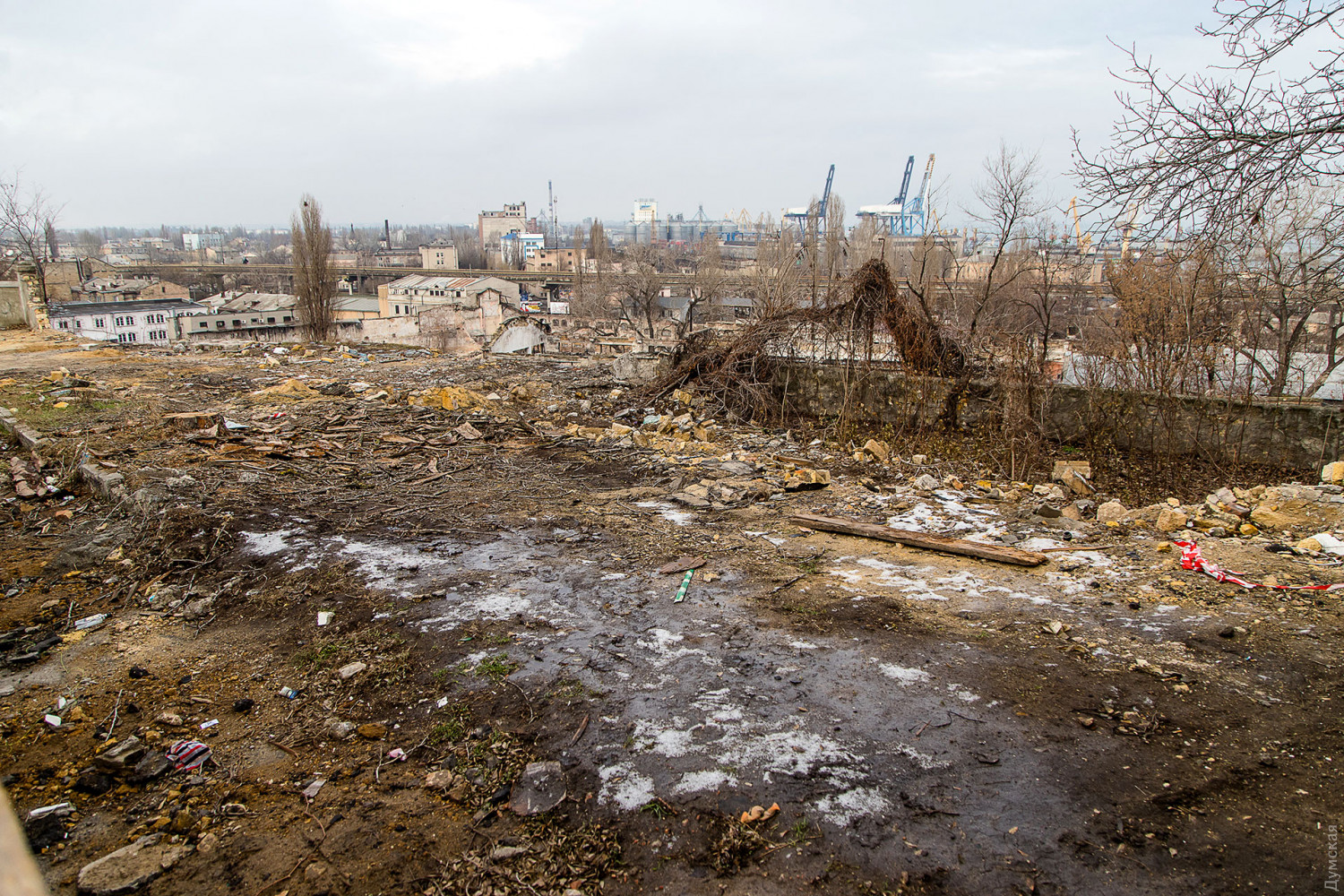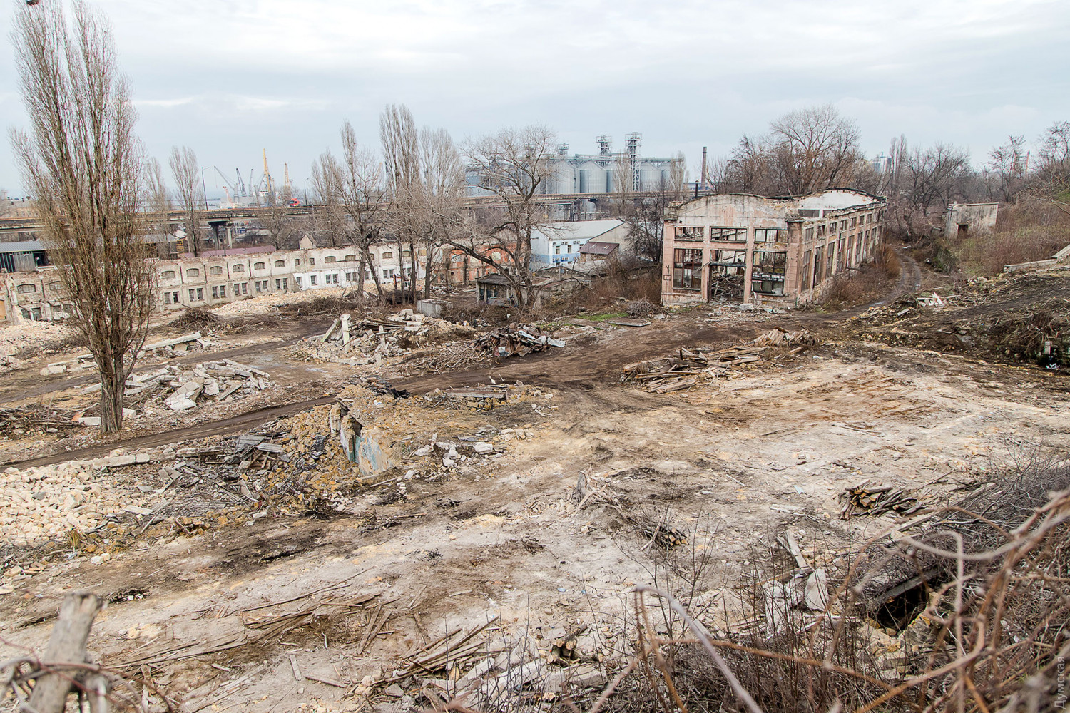 Полуразрушенные цеха судоремонтного завода (бывшие мастерские завода Беллино-Фендерих) заканчивают сносить в Одессе между спуском Маринеско, Приморской улицей и бульваром Жванецкого.
