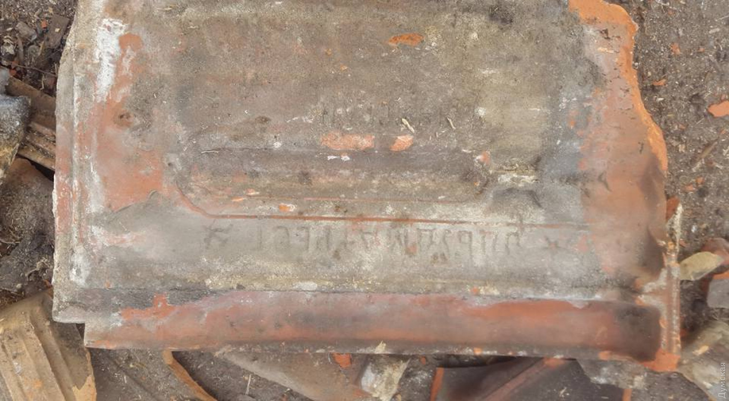 Со здания на углу Торговой и Нежинской сбили старинную глиняную черепицу. Сейчас она, разбитая, валяется огромной кучей на тротуаре. На многих плитках стоит клеймо производителя. Вместо керамической черепицы на крышу давно уже изуродованного двухсотлетнего дома кладут обычный шифер.
