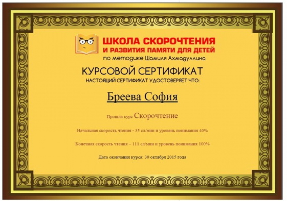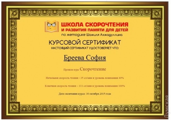 Состоялся первый выпуск одесской школы скорочтения для детей (на правах рекламы)В Одессе состоялся первый выпуск школы скорочтения для детей по методике Шамиля Ахмадуллина. Всем выпускникам вручили дипломы об окончании курсов с указанием результатов обучения. А результаты поражают. Так, среднее ускорение чтения по выпуску составляет 48%, то есть дети стали читать почти в два раза быстрее. Важно понимать, что результат зависит от того, выполняет ли ребенок небольшие домашние задания, на которые обычно нужно потратить минут 15-20. Если их не делать, то результат будет ниже. Если вы хотите, чтобы ваш ребенок начал лучше учиться, быстрее делал уроки, лучше понимал и запоминал прочитанное, тогда вам просто необходимо пройти тренинг по скорочтению для детей по авторской методике Шамиля Ахмадуллина, которая успешно работает в 13 городах СНГ. Для того, чтобы попасть в новый поток тренинга скорочтения для детей, необходимо записаться на собеседование, позвонив по телефонам (048) 78-38-518 и (094) 94-12-518 или оставив заявку на сайте, на котором, кстати, можно подробнее ознакомиться с нашим курсом. СМЕРТЬ РОСІЙСЬКИМ ОКУПАНТАМ! Помітили помилку? Виділяйте слова з помилкою та натискайте control-enter |