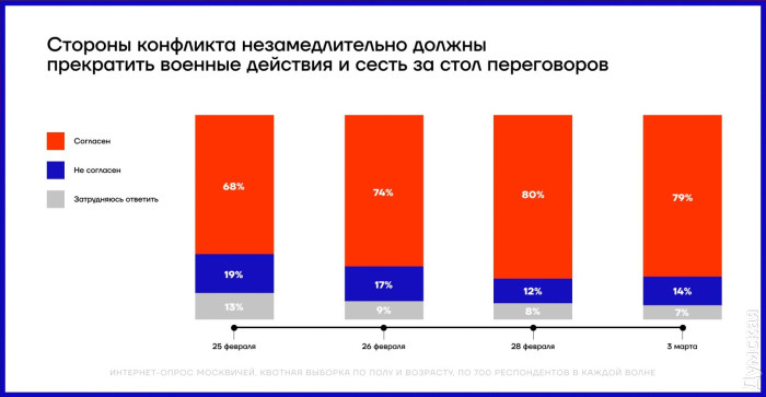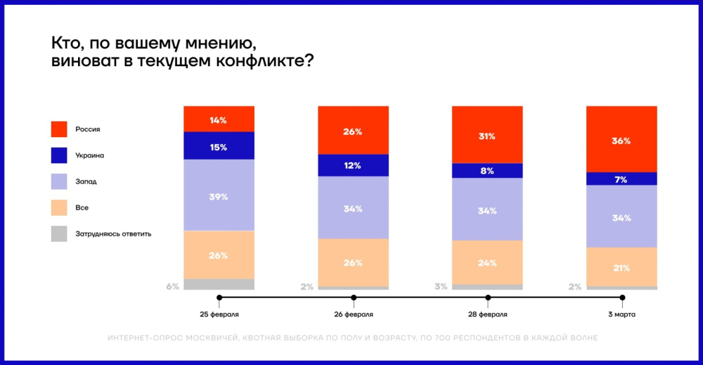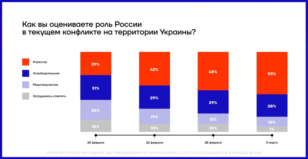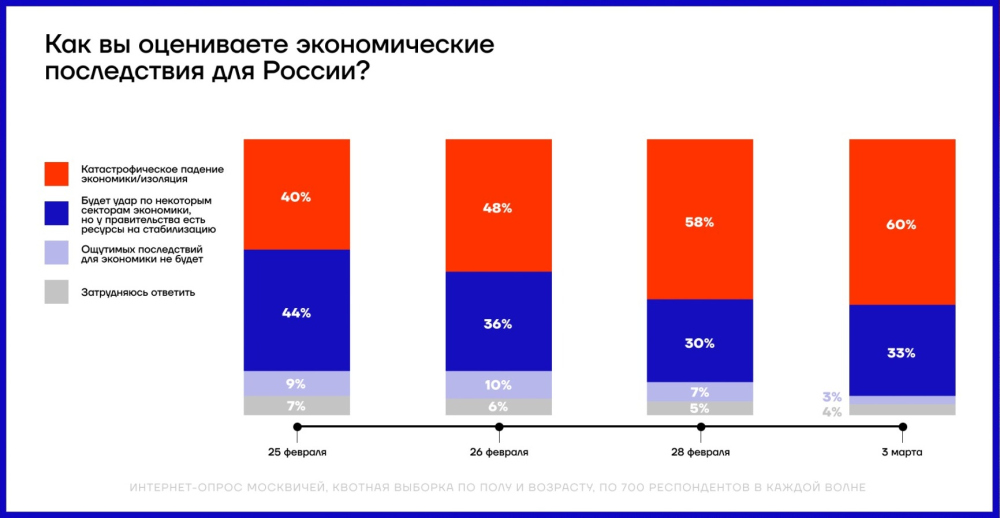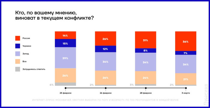 С началом войны в России нарастают антивоенные настроения и паника: результаты соцопросовС началом войны в России нарастает паника и антивоенные настроения. Об этом наглядно свидетельствуют результаты социологических опросов, которые проводил Фонд борьбы с коррупцией в период с 25 февраля по 3 марта 2022 года. Социологи выясняли, кто, по мнению россиян, виноват в нынешней войне, как ее остановить и какие последствия для экономики они ожидают. «КТО МЫ» Драматически меняется для россиян оценка роли собственной страны в нынешней ситуации. Больше половины россиян уже осознает, что их страна является агрессором — доля таких «прозревающих» увеличилась с 29 до 53%. Увеличение произошло за счет тех, кто раньше считал Россию «миротворцем», а также за счет неопределившихся. За неделю и одних, и других стало вдвое меньше. Прослойка тех, кто считает Россию «освободителем», остается относительно стабильной — порядка трети россиян, хотя здесь отмечается тренд на снижение. «КТО ВИНОВАТ» За неделю интенсивных боев в городах Украины количество тех, кто считает виновной в войне Россию, увеличилось в 2,5 раза — с 14 до 36%. При этом процент россиян, которые винят во всем родную страну, превысил процент тех, кто традиционно считает виновным во всех российских бедах условный «Запад». В то же время процент тех, кто винит в происходящем Украину, сократился вдвое — с 15 до 7%. «ЧТО ЖЕ БУДЕТ С РОДИНОЙ И С НАМИ» Как показывают исследования, в будущее родной страны россияне смотрят, мягко говоря, без особого оптимизма. Если на второй день войны катастрофическое падение экономики ожидали 40%, то через неделю таких пессимистов (а скорее, реалистов) стало уже 60%. Уменьшается прослойка тех, кто думает, что государство сможет выдержать сильный санкционный удар. За неделю процент таких «умеренных оптимистов» снизился с 44 до 33%. А вот тех, кто считает, что «искандеры посмеются над санкциями», практически не осталось: их доля с и без того небольших 9% обвалилась до 3% и оказалась на грани статистической погрешности. «ЧТО ДЕЛАТЬ» Выход из нынешней мясорубки подавляющее большинство россиян видело и видит в немедленном прекращении боевых действий и начале переговоров. Такую позицию на второй день войны поддерживали 68%, а 3 марта — уже 79%. Соответственно, процент тех, кто еще не определился или собирается «воевать до победного конца», уменьшился в полтора раза — с 32 до 21%. По прогнозам социологов, в следующие дни ситуация будет меняться еще быстрее. СМЕРТЬ РОСІЙСЬКИМ ОКУПАНТАМ! Помітили помилку? Виділяйте слова з помилкою та натискайте control-enter |