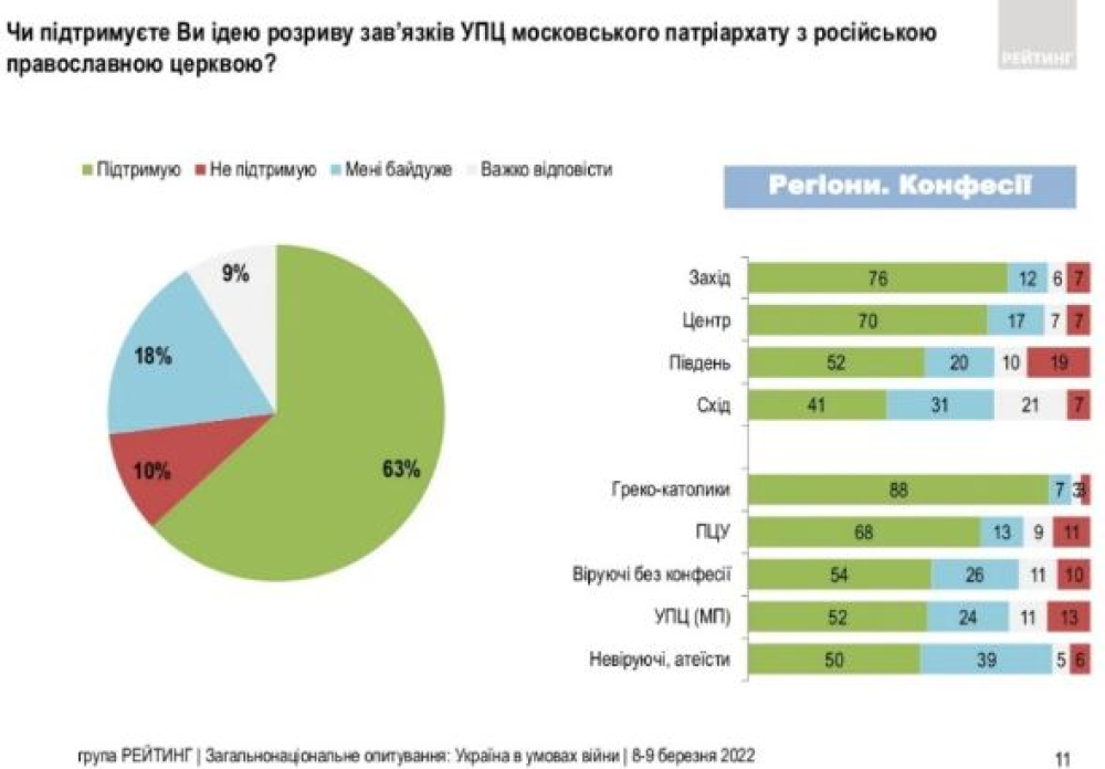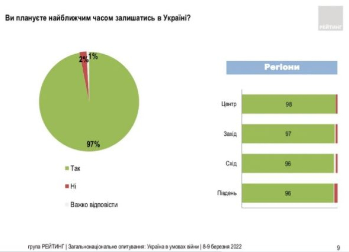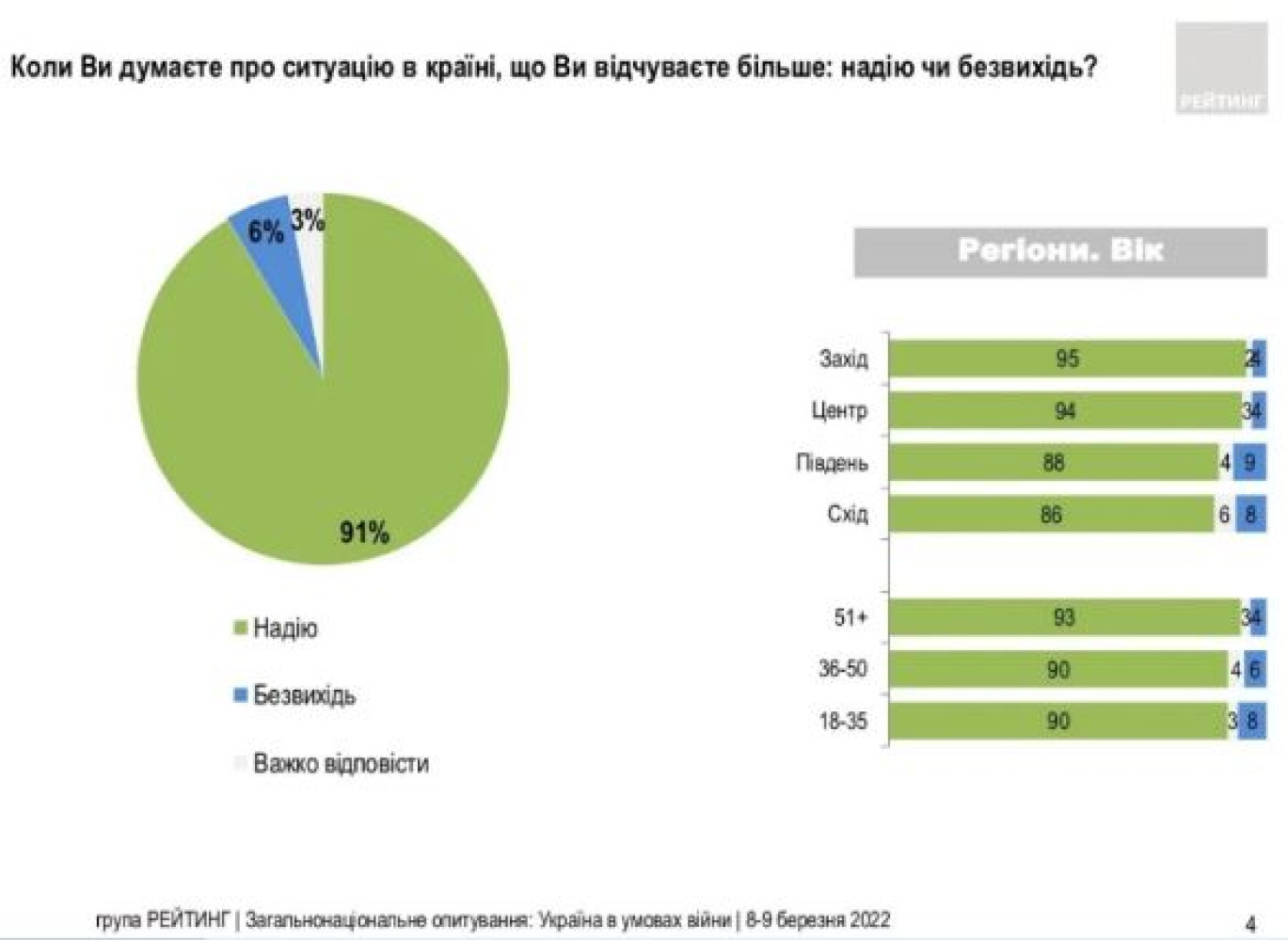 Верят в победу, помогают защитить Украину и планируют остаться в стране: более 91% украинцев смотрят в будущее с надеждой, — «Рейтинг»Абсолютное большинство наших сограждан, думая о ситуации в стране, испытывают надежду (91%), и планируют оставаться в стране (97%). Разногласия лишь в том, как быстро Украина победит. Об этом говорят результаты опроса, проведенного социологической группой «Рейтинг» 8-9 марта. 57% респондентов считают, что Украина сможет победить в войне с Россией уже в ближайшие недели, 18% думают, что мы победим за неделю, 39% – за несколько недель. Еще 18% считают, что война будет продолжаться несколько месяцев, только 9% думают, что она закончится через полгода или год. Тех, кто вообще не верит в победу, практически нет. 16% затруднились ответить на этот вопрос. Более 80% опрошенных каким-то образом помогают в защите Украины: в частности, 39% поддерживают людей и армию как волонтеры, 37% - помогают финансово. Также 18% участвуют в информационном сопротивлении, 12% – продолжают работать в критической инфраструктуре. 10% украинцев отметили, что являются участниками территориальной обороны. Только 19% заявили, что не могут помогать сейчас стране. Чаще представители старшего поколения. Однако и среди них большинство сегодня вовлечено в сопротивление. Абсолютное большинство (97%) опрошенных планируют оставаться в Украине в ближайшее время. Кроме того, на волне антироссийских настроений 63% респондентов поддерживают идею разрыва связей Украинской православной церкви московского патриархата с русской православной церковью. Не поддерживают эту идею – всего 10%. Еще 18% сказали, что им безразлично, 9% - затруднились ответить. Даже среди прихожан УПЦ московского патриархата большинство за расторжение связей с РПЦ, четверть говорят, что им безразлично и только 13% из них против разрыва. 40% украинцев уверены, что большинство россиян поддерживают войну против Украины. Еще четверть опрошенных считают, что в России каждый второй поддерживает войну, и четверть полагают, что сторонники войны там в меньшинстве. 42% опрошенных считают, что о возобновлении дружеских отношений украинцев с россиянами вообще не может быть речи. 22% думают, что это возможно через 20-30 лет после войны, 18% - что через 10-15 лет, и только 12% считают восстановление дружбы возможным через пару лет после войны. Чуть больше верят в восстановление отношений жители Юга и Востока и те, кто имеет родственников в России. Но и среди них больше трети вообще не верят в возвращение дружбы между народами. СМЕРТЬ РОСІЙСЬКИМ ОКУПАНТАМ! Помітили помилку? Виділяйте слова з помилкою та натискайте control-enter |