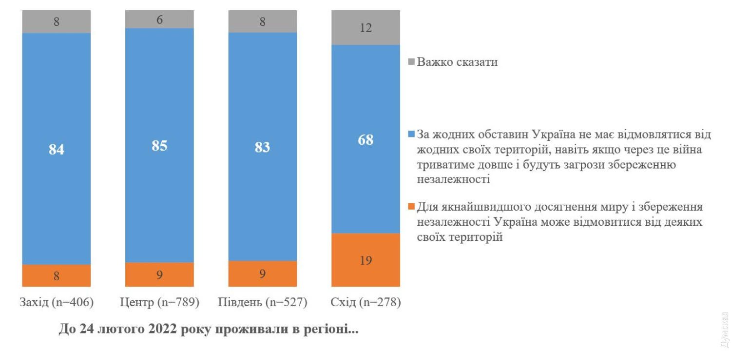 Соцопрос: 82% украинцев выступают за продолжение войны до возврата всех территорий82% украинцев считают необходимым вернуть все временно оккупированные территории, вместе с так называемыми «особыми районами» Луганской и Донецкой областей и Крымским полуостровом. Ради этого украинцы согласны на продолжение войны до победного конца, даже с учетом риска потерять государственность. Такие результаты соцопроса опубликовал Киевский международный институт социологии. По мнению подавляющего большинства опрошенных респондентов, Украина «ни при каких условиях не должна отказываться от каких-либо своих территорий». 10% респондентов готовы на территориальные компромиссы ради скорейшего достижения мира, еще 8% затруднились ответить на этот вопрос. Отметим, мнение жителей запада, центра и юга страны практически идентично. На западе Украины готовы продолжать войну до победы 84% опрошенных, в центральных регионах – 85%, на юге – 83%. На востоке за возвращение всех земель выступает 68% респондентов, на компромисс готовы 19%. СМЕРТЬ РОСІЙСЬКИМ ОКУПАНТАМ! Помітили помилку? Виділяйте слова з помилкою та натискайте control-enter |