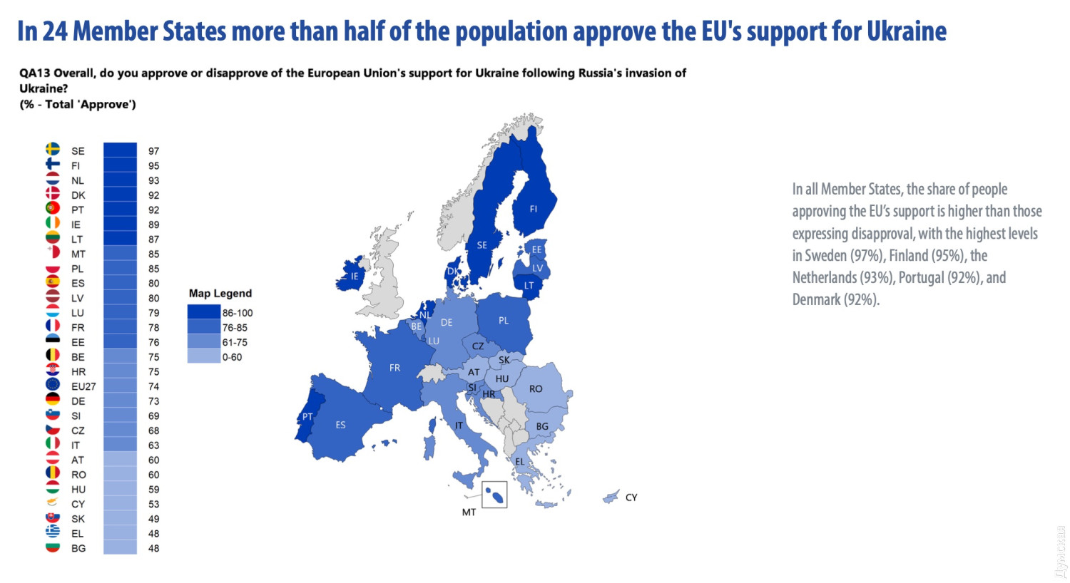Соцопитування: більшість громадян Євросоюзу підтримують Україну74% громадян Європейського Союзу підтримують Україну в умовах війни проти нацистської Росії. 73% підтримують ті кроки, які роблять їхні уряди для надання допомоги Україні. Такі результати показало соцопитування Eurobarometer, проведене в жовтні-листопаді на замовлення Європейської комісії. 33% громадян ЄС повністю підтримують Україну, 41% скоріше підтримують. Тільки 7% заявили, що повністю не підтримують нашу країну, а ще 16% скоріше дотримуються такої думки. Найбільша підтримка зафіксована у Швеції (97%), Фінляндії (95%), Нідерландах (93%), Данії (92%) та Португалії (92%). Найменша у Словаччині (49%), Болгарії (48%) і Греції (48%). 31% респондентів заявили, що згодні з тими заходами, які їхні уряди вживають для підтримки України, ще 42% скоріше за все їх підтримують. 8% повністю не згодні з політикою уряду щодо України, ще 16% скоріше дотримуються такої ж думки. Найвищий рівень підтримки курсу уряду на підтримку України у Фінляндії (96%), Швеції (96%), Нідерландах (93%), Данії (92%), Італії (91%) та Португалії (90%). Найгірша думка громадян Болгарії (49%), Кіпру (48%), Словаччини (47%) і Греції (46%). Нагадаємо, у вересні соцопитування Eurobarometer засвідчило, що 92% громадян ЄС підтримують надання Україні гуманітарної допомоги, 90% за надання притулку українським біженцям, 78% - за економічні санкції проти росії, 68% опитаних вважають, що країни ЄС мають фінансувати закупівлю озброєння для України. СМЕРТЬ РОСІЙСЬКИМ ОКУПАНТАМ! Помітили помилку? Виділяйте слова з помилкою та натискайте control-enter |