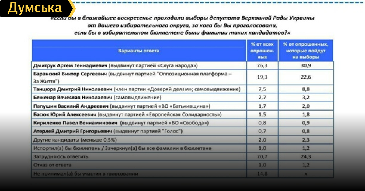 Появились новые результаты социологического исследования от «Социополис». Так, согласно данным социологов, по 133 округу победу на предстоящих выборах одержит кандидат в народные депутаты от политической партии «Слуга народа» Артем Дмитрук, а по 135 округу – Алексей Леонов. За Дмитрука готовы проголосовать 30,9% избирателей. В 135 округе, согласно данным исследования, 37,6% избирателей готовы проголосовать за Алексея Леонова. Его ближайший конкурент, Кивалов, набирает всего 24,6%. СМЕРТЬ РОСІЙСЬКИМ ОКУПАНТАМ! Помітили помилку? Виділяйте слова з помилкою та натискайте control-enter