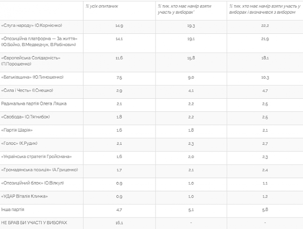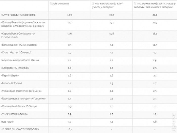 Соцопрос: рейтинги «Евросолидарности», «ОПЗЖ» и «Слуги народа» почти сравнялисьЧетыре партии проходят в парламент, если бы выборы состоялись в ближайшее время. Таковы данные соцопроса Центра Разумкова. Так, наибольшую поддержку получила бы политическая партия «Слуга народа» — за нее готовы отдать свой голос 15% всех опрошенных или 22% тех, кто примет участие в выборах и определился, за какую партию голосовать. Далее следует «Оппозиционная платформа — За жизнь», набравшая соответственно 14% и 22%», на третьем месте «Европейская солидарность», за которую готовы отдать свой голос 12% и 18% определившихся, за ВО «Батькивщина» — 7,5% и 10%. На грани колеблется партия «Сила и честь» — ее готовы поддержать 3% и 5%. Остальные партии не проходят 5% барьер. К слову, 52% опрошенных выступают за досрочное прекращение полномочий Верховной Рады Украины и проведение досрочных выборов. Не поддерживают такую инициативу 31%. Исследование проводилось с 29 января по 3 февраля 2021 года методом интервью «лицом к лицу» по месту жительства респондентов. СМЕРТЬ РОСІЙСЬКИМ ОКУПАНТАМ! Помітили помилку? Виділяйте слова з помилкою та натискайте control-enter Новини по цій темі: |