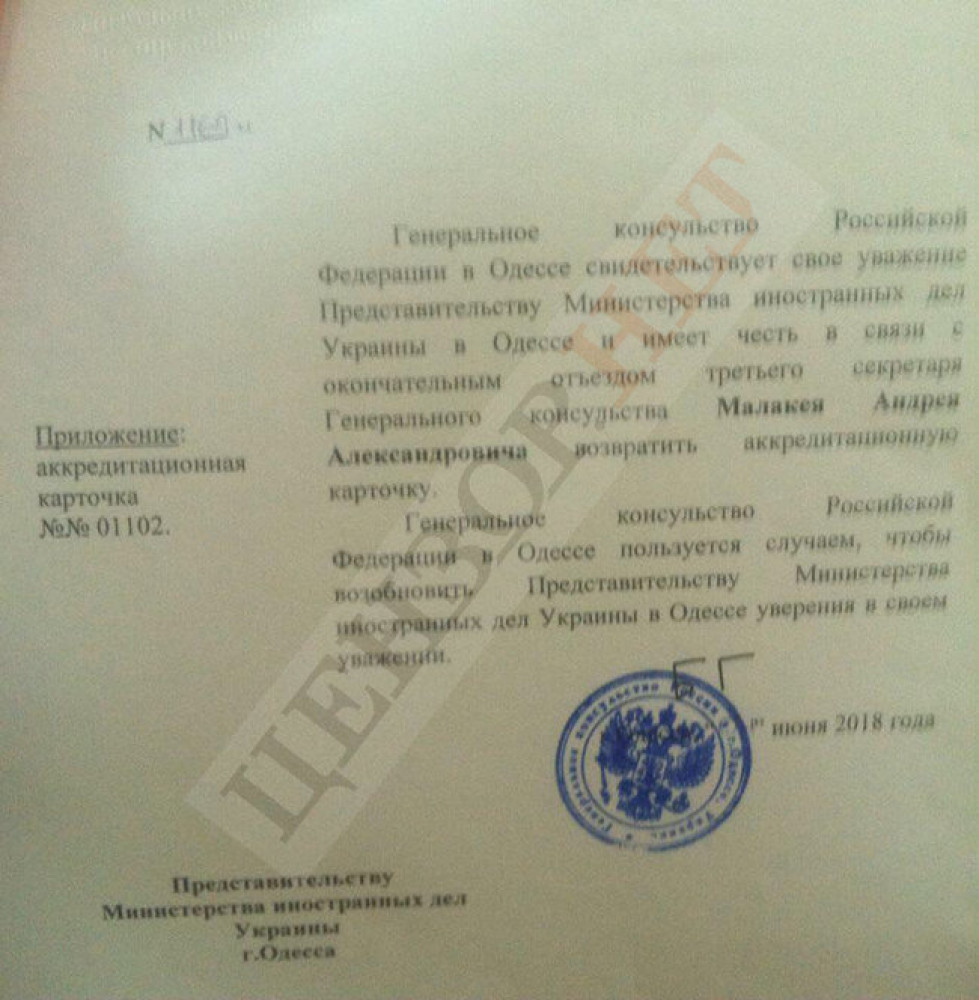 Министерство иностранных дел Российской Федерации вернуло аккредитационную карточку третьего секретаря Генерального консульства РФ в Одессе Андрея Малакея МИДу Украины в связи с окончательным отъездом дипработника из нашей страны.