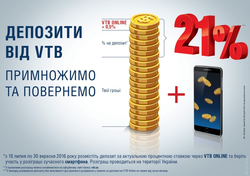 Советы выбора надежного банка, или Как заставить деньги работать (новости компаний)Хранить деньги дома – худшее, что можно придумать. Сбережения, которые лежат даже в самом надежном сейфе, становятся жертвой инфляции. По мнению финансовых экспертов, в нынешних реалиях лучше всего разместить деньги в надежном банке на депозите. Но как выбрать этот самый банк и оптимальный депозит? Надежность банка можно оценить по нескольким признакам: готовность собственников банка поддерживать, докапитализировать банк в кризисные периоды, размеры капитала банка, «возраст» банка и, конечно же, отзывы реальных клиентов. После того, как вы убедитесь в надежности банка, вам предстоит разобраться, какой же вклад самый выгодный. Как правило, чем дольше срок вклада, чем больше его сумма и чем меньше вы используете средства, размещенные на депозите, тем выше процент по вкладу. В зависимости от срока вклады могут быть «срочными», когда средства размещаются на определенный срок – от одного месяца до нескольких лет, или «бессрочными», когда клиент может забрать свои деньги в любое время. По вкладам до востребования ставки обычно самые маленькие. По срочным они выше, но в случае досрочного снятия средств банк, как правило, снижает процент по депозиту. И еще один совет – обращайте внимание на акции и специальные предложения, которые банки запускают для привлечения новых клиентов и укрепления лояльности «старых» вкладчиков, предлагая им чуть более выгодные условия. Например, VTB Банк (Украина) сегодня предлагает депозит «Конструктор +». Его особенность в том, что условия этого вклада –самые простые и понятные на рынке. Помимо того, что средства размещаются в надежном банке (а в кризисный период банк возвращал все депозиты без задержек), это финучреждение предлагает вклады по весьма высокой ставке – до 21%, что позволяет вкладчику самому подобрать параметры вклада: срок размещения, способ выплаты процентов, наличие возможности досрочного расторжения и прочее. Кроме того, с 18 июля по 30 сентября 2016 года у вас есть возможность выиграть современный смартфон. Чтобы принять участие в розыгрыше, вам нужно разместить депозит по актуальной процентной ставке через VTB ONLINE. С правилами можно ознакомиться на официальном сайте банка: www.vtb.ua СМЕРТЬ РОСІЙСЬКИМ ОКУПАНТАМ! Помітили помилку? Виділяйте слова з помилкою та натискайте control-enter |