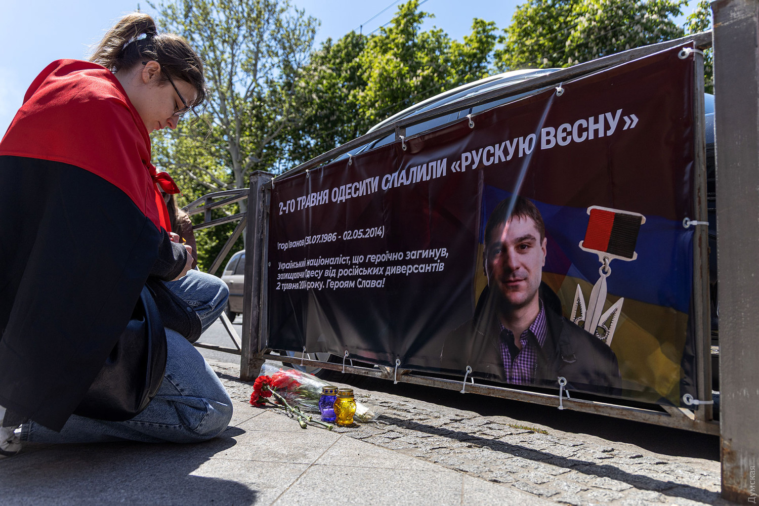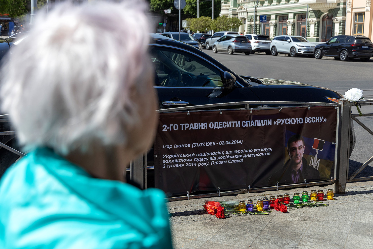 На перехресті вулиць Преображенської та Дерибасівської відбулася акція пам'яті, участь у якій взяли трохи більше десятка осіб — переважно молодь, представники патріотичної громадськості. Ті, хто прийшов, вважають, що 2 травня це не день трагедії, про ті події треба згадувати як про перемогу проукраїнського спротиву над спробою реалізації так званої «русской весны» в місті. «Цього дня одесити »спалили «русскую весну», і перед нами залишилося тільки одне завдання — спалити її остаточно, — заявила очільниця організації «Делаем вам нервы» Катерина Мусієнко. — На жаль, вона все ще серед нас: ми чуємо багато російської мови, перебуваємо за 500 метрів від пам'ятників Утьосову, Пушкіну, Воронцову, в оточенні російських церков у центрі міста. Усе це має бути переможено так само, як було переможено диверсантів і потенційних окупантів 2 травня 2014 року. Я рада, що в інформаційному полі все частіше говорять не про трагедію, а про перемогу — перемогу над «русским миром». Під час акції учасники прикріпили до парапету банер у пам'ять про Ігоря Іванова, вшанували загиблих хвилиною мовчання, поклали квіти і запалили лампадки. А ось квіти до Будинку профспілок приносять переважно літні люди. Тут дуже небагатолюдно. Поліція вишикувалася по периметру, у охочих пройти правоохоронці перевіряють документи. З боку Пироговської та Італійського бульвару поставили блокпости. Символічно, що на самому Куликовому полі все ще стоїть знищена російська техніка — виставку «Назалежність», нагадаємо, приурочили до дня визволення Одеси від німецько-румунських загарбників. Нагадаємо, 10 років тому, 2 травня 2014 року, в Одесі відбувалися зіткнення проросійських і проукраїнських сил. Загалом того дня загинуло 48 осіб. Судові розгляди щодо частини епізодів тривають досі. Організаторів тих подій так і не встановили.