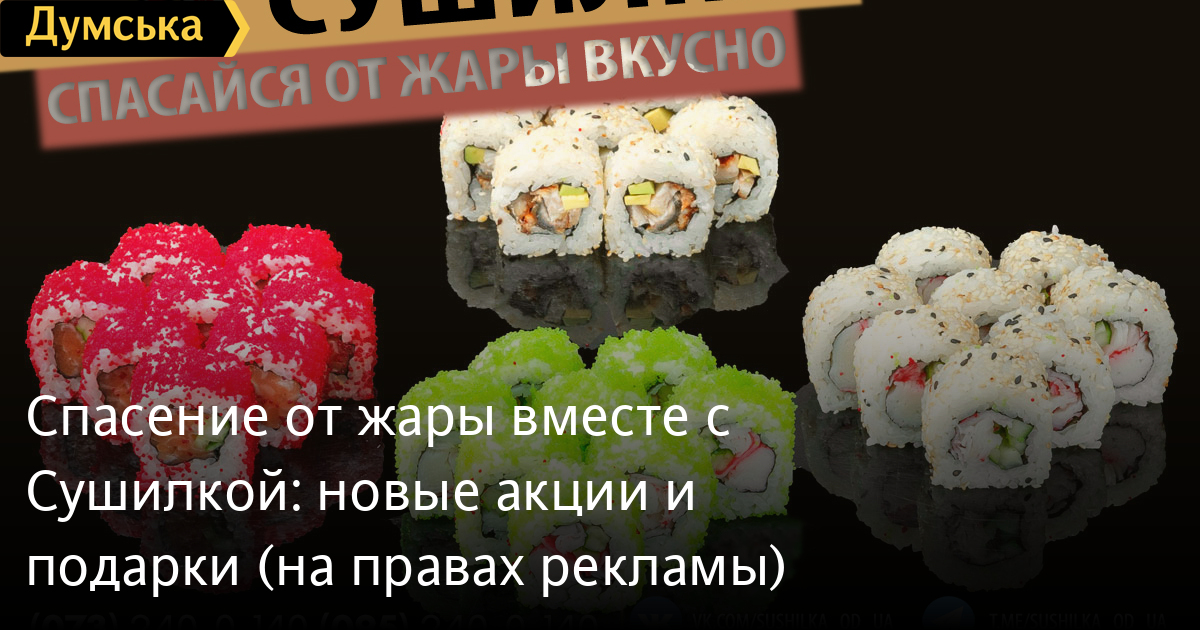 Служба доставки еды «Сушилка» вводит две новые акции, которые приятно порадуют любителей роллов в летнее время. Так, за заказ сета «Калифорния» вы получите совершенно бесплатно ролл «Филадельфия». Акция действует до 4 июля включительно. Кроме того, до конца лета каждый новый клиент будет получать в подарок новинку — ароматный, утоляющий жажду лимонад. Заказ можно сделать на сайте sushilka.od.ua или по телефонам: 073-240-0-140; 095-240-0-140; 096-240-0-140; 048-735-29-99. СМЕРТЬ РОССИЙСКИМ ОККУПАНТАМ! Заметили ошибку? Выделяйте слова с ошибкой и нажимайте control-enter |