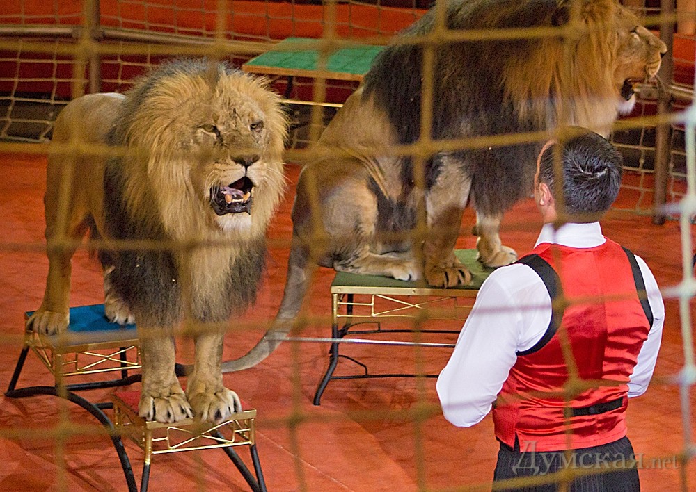 Государственная цирковая компания Украины привезла в Одессу цирк «Триумф», главные звезды которого — обладатель московского «Золотого слона» и «Серебряного клоуна» Монте-Карло, дрессировщик львов Владислав Гончаров и его девятилетний сын Тимур. Оба, без сомнения, — уникальные артисты. Старший Гончаров – дрессировщик-самоучка, вопреки всем канонам работает с десятью львами в одиночку, без плети и поощрительных кусочков мяса, порою даже поворачиваясь к плотоядным спиной. Его сын Тимур в девять лет бесстрашно заходит в клетку с хищниками и участвует в представлении практически наравне с отцом.