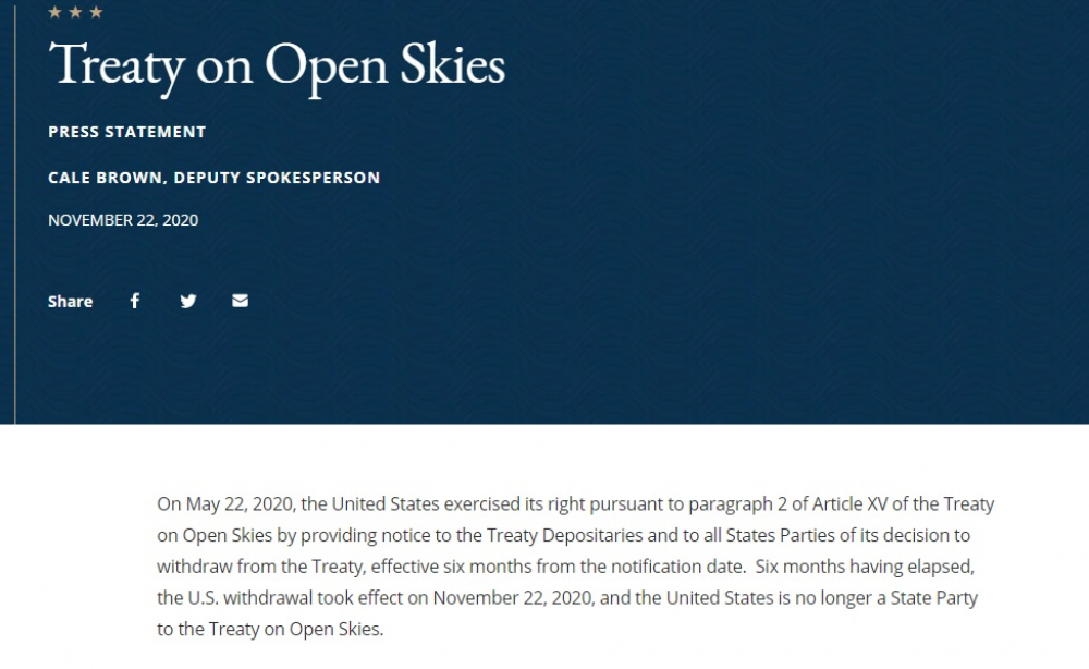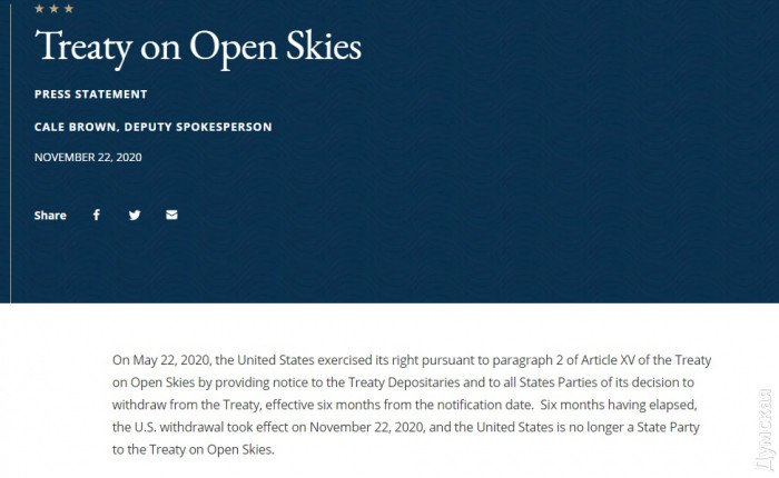 Соединенные Штаты Америки официально вышли из десятилетнего договора по открытому небу. Договор позволяет 34 странам-участницам проводить короткие разведывательные полеты без оружия над другими странами для сбора данных об их вооруженных силах и деятельности. США объяснили свой выход нарушениями со стороны России. Об этом говорится в заявлении Госдепартамента США, опубликованном в воскресенье, 22 ноября. Как пишет издание Deutsche Welle, Госдепартамент сообщил о намерении Вашингтона выйти из Договора по открытому небу еще 21 мая, объяснив этот шаг нарушением условий договора со стороны Москвы. США обвинили РФ в грубом нарушении договора на протяжении многих лет, в том числе в сфере контроля над вооружениями. В частности, Москва отказала в проведении воздушного наблюдения в зоне длинной 10 км вдоль своей границы с грузинскими регионами Абхазия и Южная Осетия, а также разместила свой аэродром дозаправки в украинском Крыму, говорится в заявлении Госдепа. Вашингтон также обвинил Москву в «нелегальном введении ограничения на дальность перелета над Калининградом» и в «неоправданном отказе США и Канаде в наблюдательном полете за крупными российскими военными учениями в 2019 году». СМЕРТЬ РОССИЙСКИМ ОККУПАНТАМ! Заметили ошибку? Выделяйте слова с ошибкой и нажимайте control-enter |