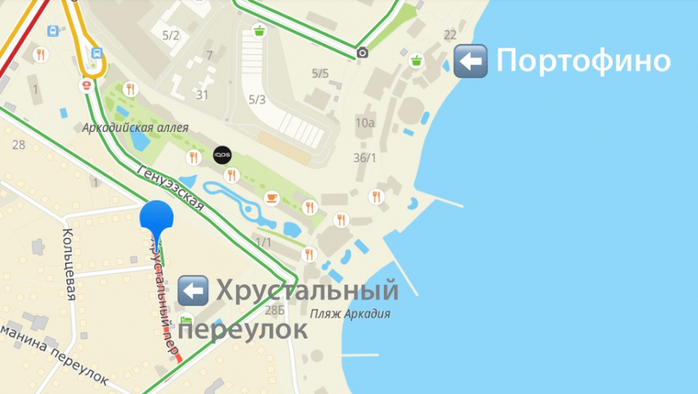 В Аркадии, действительно, есть Хрустальный переулок, однако он расположен на внушительном расстоянии от комплекса «Портофино» на побережье.
