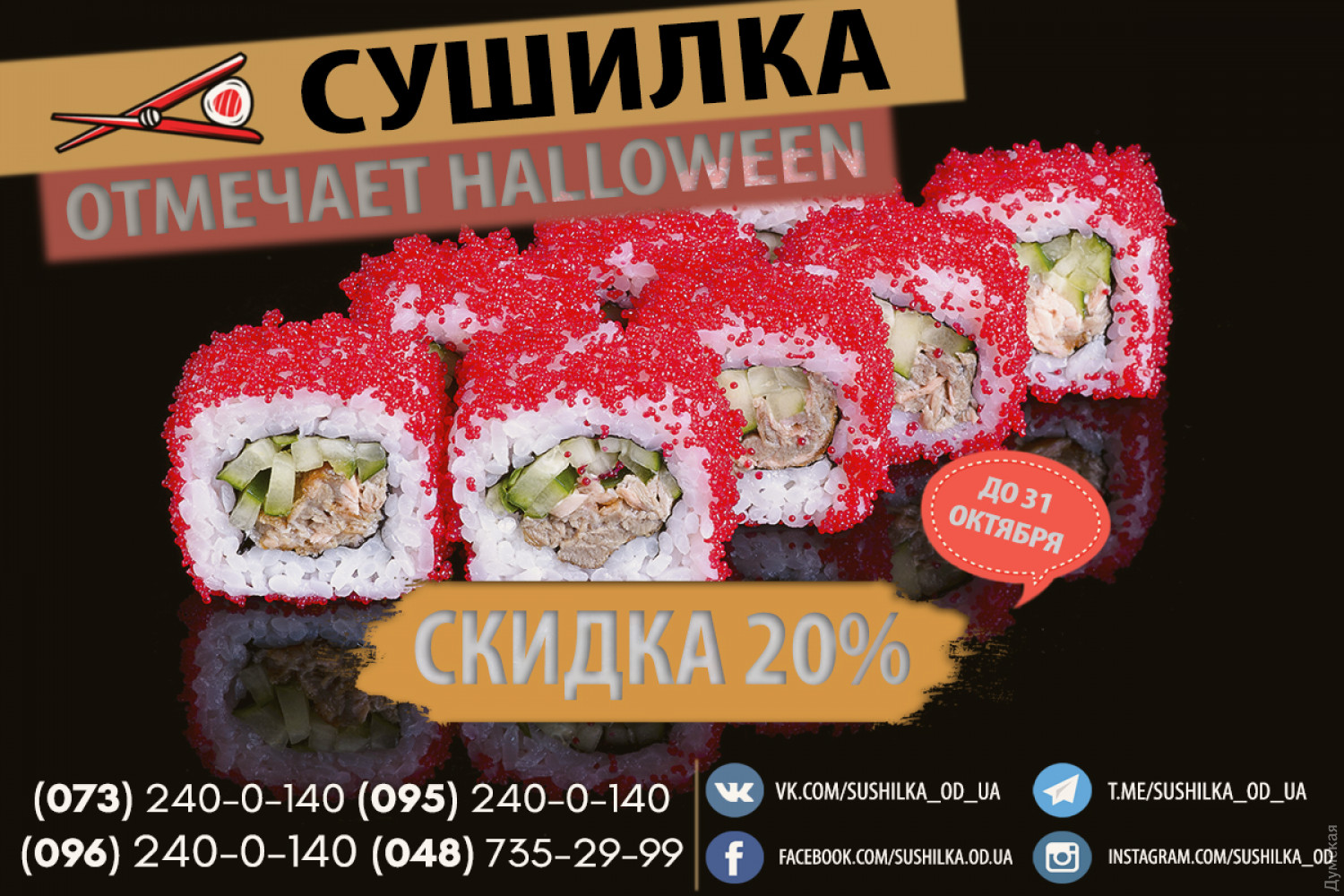 Страшно вкусно: сервис «Сушилка» дарит 20% скидки к празднику (на правах рекламы)Приближается страшный, ужасный и очень веселый праздник Хэллоуин. Подготовиться к нему решила и «Сушилка». Так, до 31 октября включительно сервис дарит 20% скидку на все меню. Отметим, что данная акция не распространяется на товары из категории «Сеты» и «Напитки». Напомним, ранее «Сушилка» расширила меню, добавив множество роллов, гунканов, пицц и салатов. Заказ можно сделать на сайте sushilka.od.ua или по телефонам: 073-240-0-140; 095-240-0-140; 096-240-0-140; 048-735-29-99. СМЕРТЬ РОСІЙСЬКИМ ОКУПАНТАМ! Помітили помилку? Виділяйте слова з помилкою та натискайте control-enter |