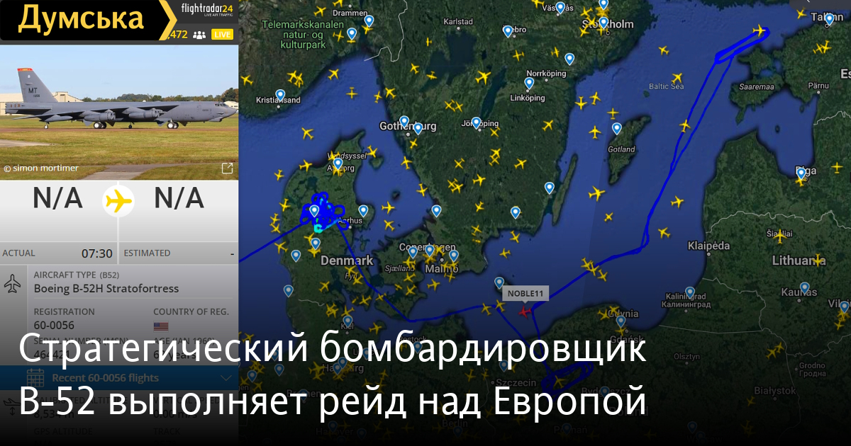Прямо зараз один зі «стратегів» з реєстраційним номером 60-0056 перебуває в повітряному просторі Данії, повертаючись на аеродром вильоту.