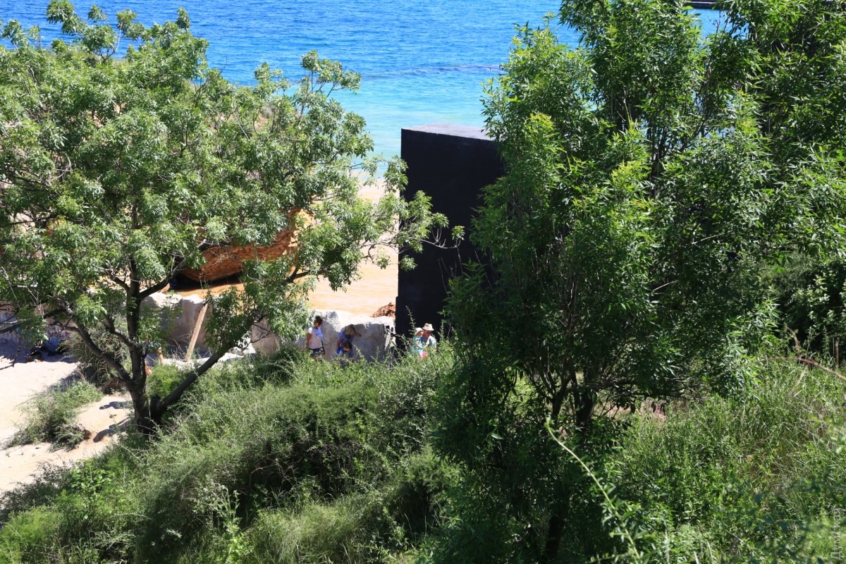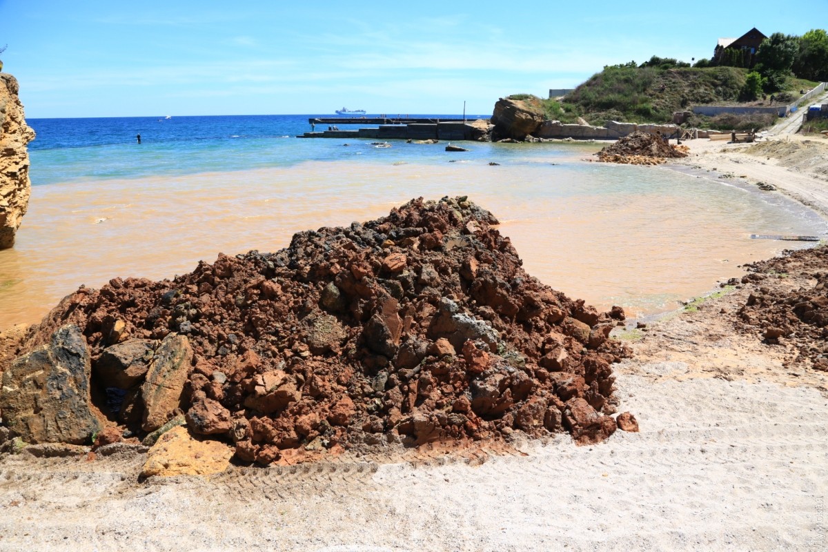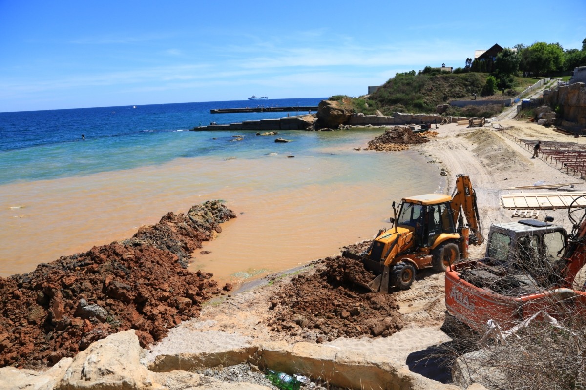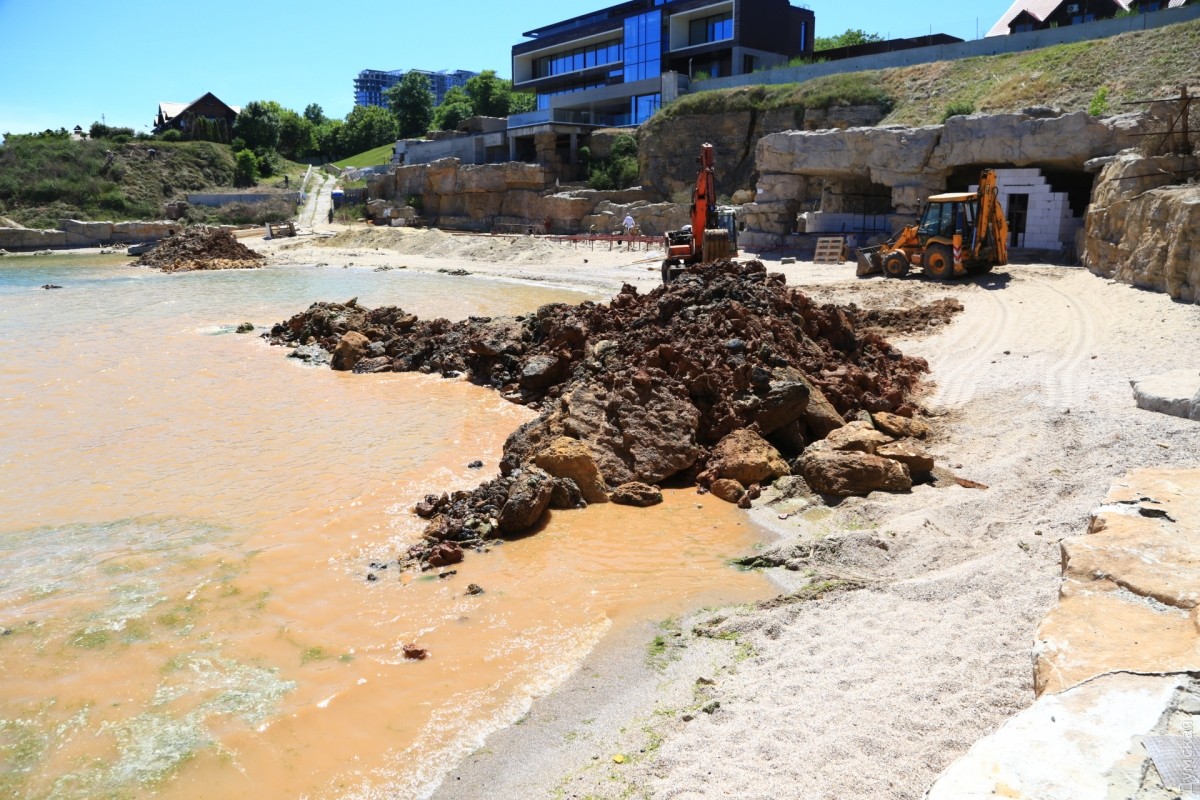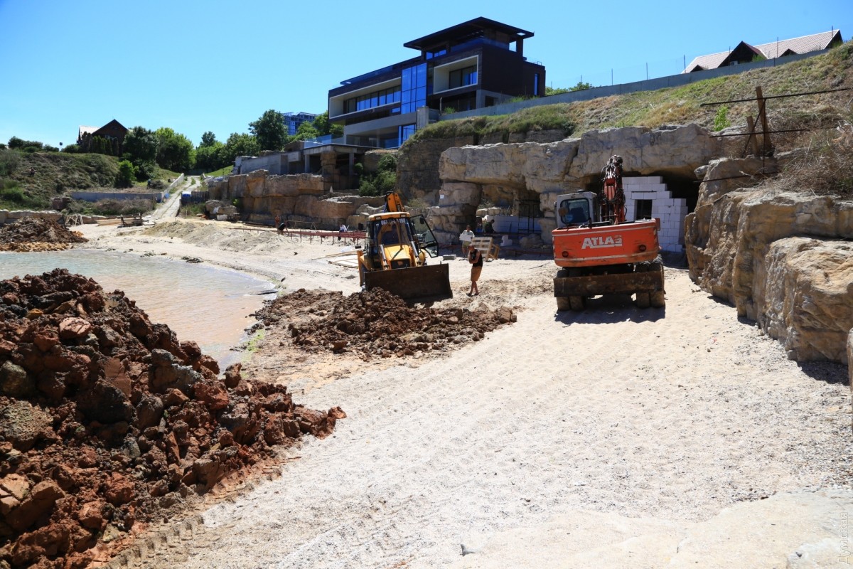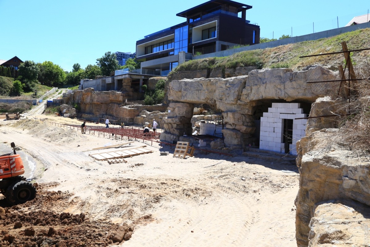 Прораба застать не удалось. Охранник рассказал, что это «муниципальная стройка». Экскаваторы расчищают дно от камней, а на месте четырехметровой стены будет, по его словам, декоративная ограда с арочным входом. Гроты перекрывают пеноблоками. На песке лежит большая металлическая конструкция — видимо, будущая летняя площадка кафе. По нашим данным, это единственный пляж Одессы, который находится в частной собственности. Его незаконно включили в состав земельного участка, на котором расположена вилла.