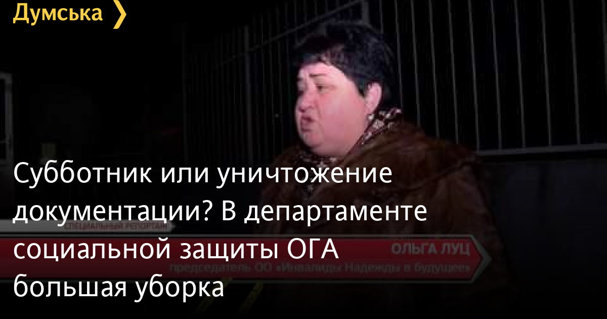 Субботник или уничтожение документации? В департаменте социальной защиты ОГА – большая уборкаСубботник или уничтожение документации? В департаменте социальной защиты населения облгосадминистрации проводят большую уборку, которая вызвала беспокойство у представителей общественной организации инвалидов. СМЕРТЬ РОССИЙСКИМ ОККУПАНТАМ! Заметили ошибку? Выделяйте слова с ошибкой и нажимайте control-enter Думская ТВ. Сюжеты:
