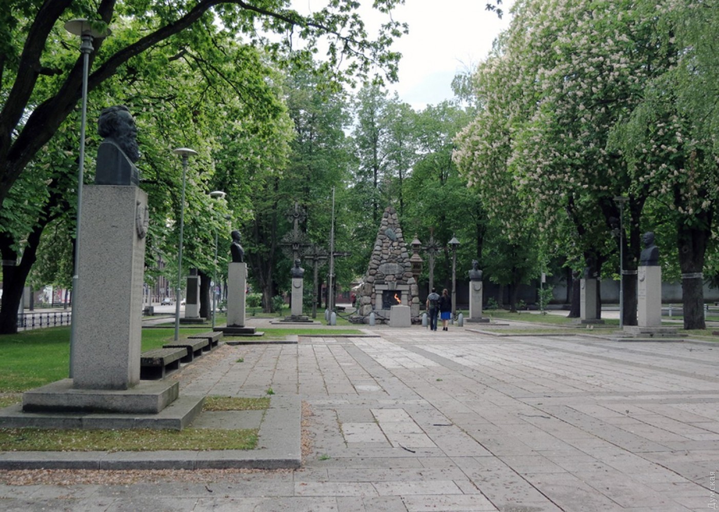 Затем мы направились на площадь Единства (Vienibes), где установлены знаковые для литовцев памятники. Здесь стоит мемориал Неизвестному солдату с Вечным огнем и бюсты выдающихся граждан. Здесь можно увидеть памятники тем, кто сохранил литовский язык и письменность (которая была под запретом вплоть до 1904 года) — матери, которая прядет нити и учит дочку читать, и смельчаку, который несет через границу отпечатанные в Пруссии и запрещенные в России литовские книги.