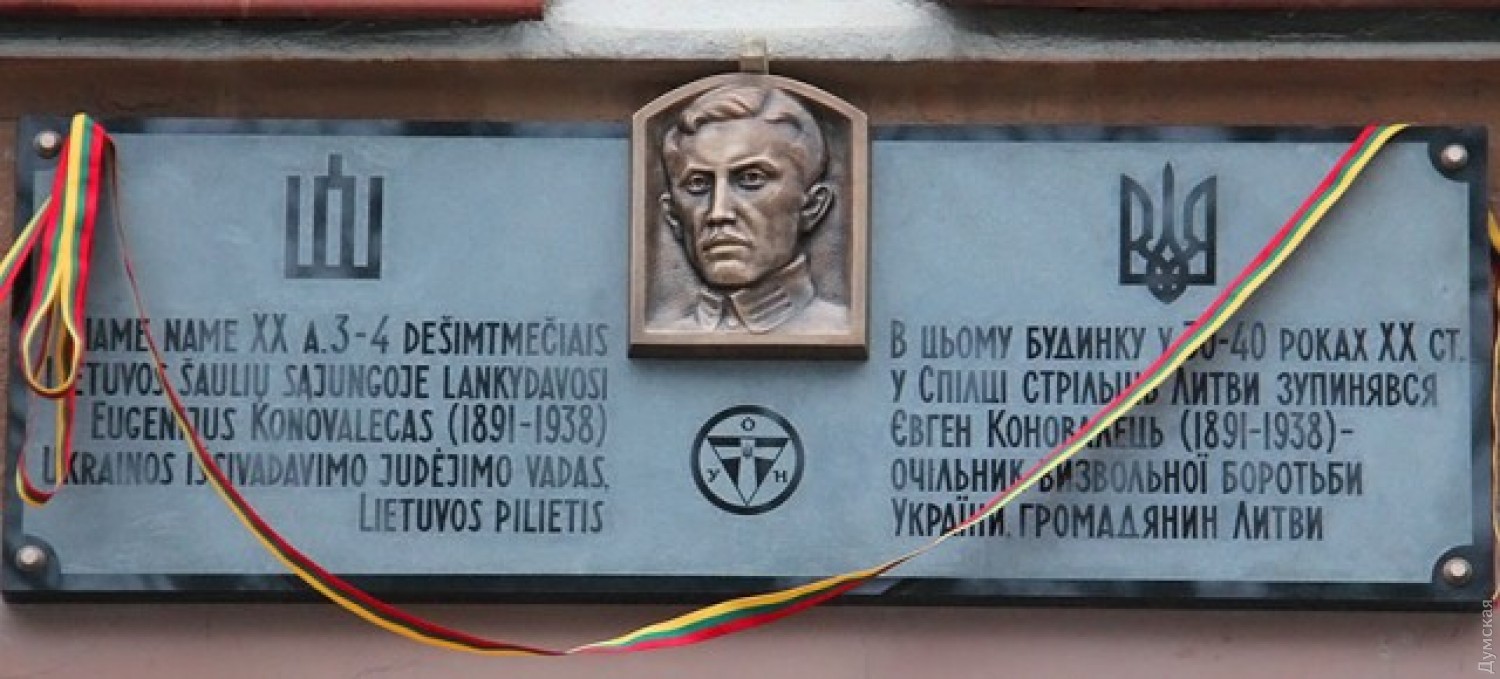 Еще в межвоенный период литовские стрелки поддерживали тесные отношения с украинскими организациями. Здесь хорошо помнят, что основатель ОУН Евгений Коновалец имел литовское гражданство. Это позволило ему ездить по всему миру и, в частности, поднимать вопрос о международной реакции на Голодомор в Женеве, в Лиге Наций. Неудивительно, что во время визитов в Каунас Коновалец останавливался в здании Союза стрелков на Аллее Свободы (Laisvės alėja) — главной улице города. В память об этом в 2012 году здесь торжественно открыли мемориальную доску, под которой мы и сфотографировались — несмотря на поздний вечер и проливной дождь.