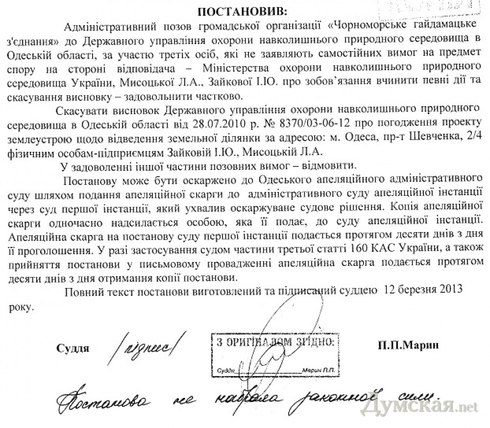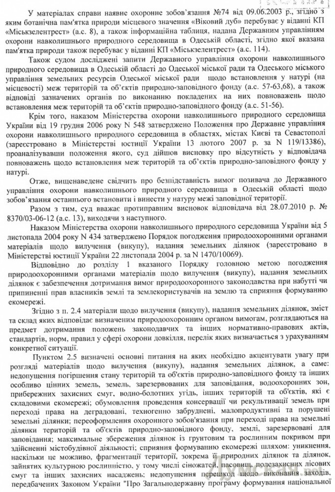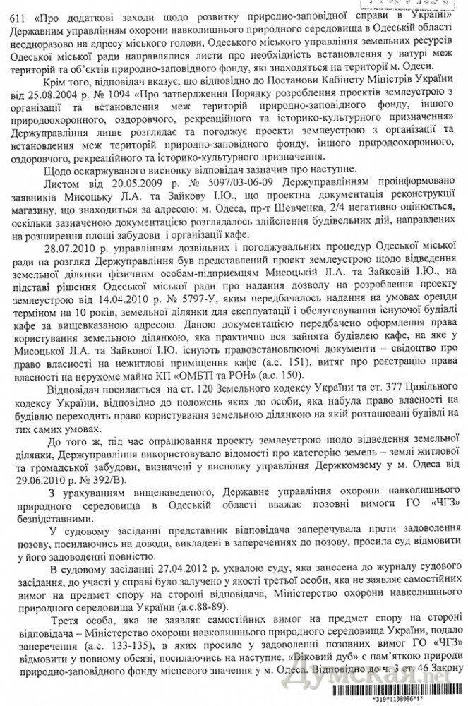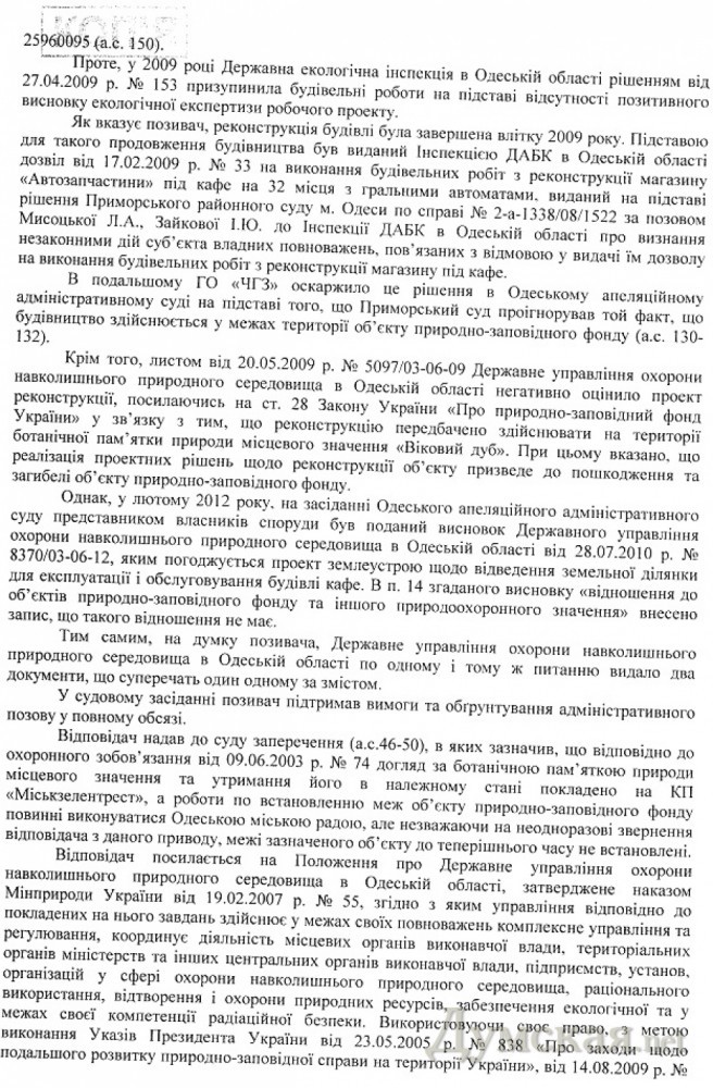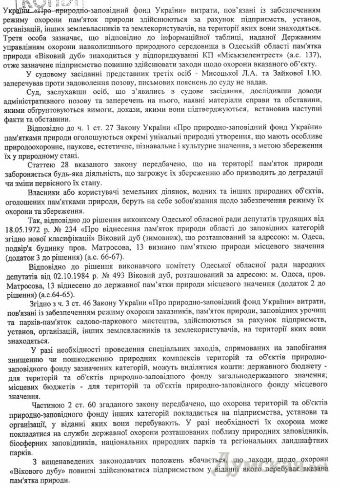 Одесский окружной административный суд отменил вывод Государственного управления охраны окружающей среды Одесской области, которым было согласовано выделение участка земли под строительство на проспекте Шевченко, 2/4 в Одессе. На этом участке расположено старейшее дерево Одессы «Казацкий дуб» (он же «Черная ночь»). О вердикте суда «Думской» сообщил истец – руководитель общественной организации «Черноморское гайдамацкое соединение» Сергей Гуцалюк. Суд вынес постановление об отмене согласования на строительство 12 марта. Скорее всего, ответчик будет подавать апелляцию. В случае, если суд второй инстанции оставит данное решение в силе, то строение возле старейшего дуба (ныне магазин «Веснянка») будет считаться незаконным. Как ранее писала «Думская», вывод о согласовании проекта землеустройства об отведении земельного участка по проспекту Шевченко, 2/4 выдан Государственным управлением охраны окружающей среды в Одесской области в 2010 году. Этим документом государственная инстанция подтвердила, что данный участок не является природно-заповедным фондом и строительство на нем не угрожает существованию старейшего дерева Украины. 28-метровому дубу «Черная ночь» минимум 220 лет, то есть он старше Одессы. По легенде, дерево посадили черноморские казаки, когда, выполняя указ императрицы Екатерины Великой, уходили на Кубань. С северной стороны территория у дуба была частично застроена еще в конце XIX века. Но с южной, солнечной стороны, где находится большая часть кроны и куда тянется корневая система, земельный участок стоял свободным до эпохи перестройки. В середине 1980-х там появился металлический павильон с магазинами. В конце 1990-х в павильоне разместился магазин «Автозапчасти» фирмы «Иван», В 1999-м бизнесмены самовольно захватили дополнительную территорию и построили возле павильона капитальное сооружение, разместив в нем СТО. Вредные выбросы, разливы нефтепродуктов крайне негативно сказались на состоянии дуба. К счастью, вмешалась Государственная экологическая инспекция, приостановив производственную деятельность СТО. «Иван» продал помещение. После нескольких перепродаж, в 2003-м году здание приобрели некие физические лица. Новые владельцы сразу ликвидировали временный павильон, но капитальную постройку оставили. В 2004-м году они начали ее «реконструкцию», чтобы разместить кафе и зал игровых автоматов. Поскольку работы проводились без разрешений, в 2005-м году стройку остановила прокуратура. Однако в апреле 2009-го строительство казино возобновилось и летом того же года его завершили. Когда Верховная Рада запретила игорный бизнес, здание отдали в аренду под магазин бытовой химии сети «Веснянка». Результатом всех этих строек и перестроек стало сокращение свободной территории вокруг заповедного дуба. От определенных законодательством 15 соток (по кроне) осталось всего пять! Специалисты-ботаники утверждают: это крайне негативно сказывается на состоянии дерева, и в конце концов, может привести к его гибели. СМЕРТЬ РОСІЙСЬКИМ ОКУПАНТАМ! Помітили помилку? Виділяйте слова з помилкою та натискайте control-enter |