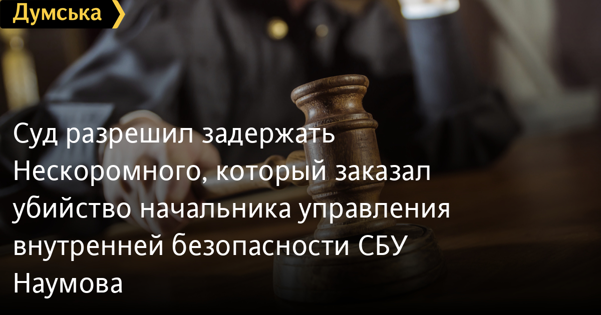 Суд разрешил задержать Нескоромного, который заказал убийство начальника управления внутренней безопасности СБУ НаумоваУкраинский суд разрешил задержать бывшего первого заместителя главы Службы безопасности Украины Дмитрия Нескоромного. Это следует из информации о его розыске, размещенной на сайте Министерства внутренних дел. Отмечается, что Нескоромный исчез 29 января и объявлен в розыск. Выдано разрешение на его задержание для привода в суд. Экс-сотруднику СБУ инкриминируют ст. 348 (посягательство на жизнь сотрудника правоохранительного органа) Уголовного кодекса Украины. Ему грозит пожизненное заключение. Напомним, 23 января стало известно, что полковник специального подразделения «Альфа» Андрей Расюк задержан по подозрению в подготовке убийства бригадного генерала СБУ Андрея Наумова. Заказчиком преступления называли бывшего замглавы СБУ Дмитрия Нескоромного. Уже 27 января Нескоромному объявили о подозрении в заказе убийства Наумова. Сотрудники СБУ вручили подозрение его родным, поскольку самого Нескоромного не могли найти. СМЕРТЬ РОССИЙСКИМ ОККУПАНТАМ! Заметили ошибку? Выделяйте слова с ошибкой и нажимайте control-enter |