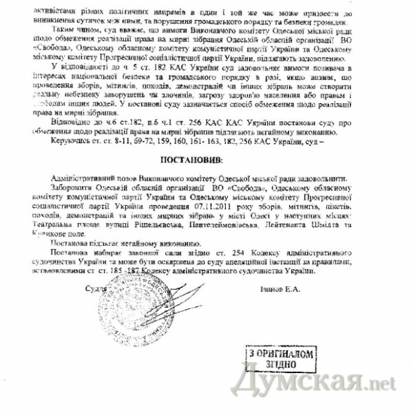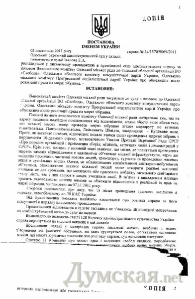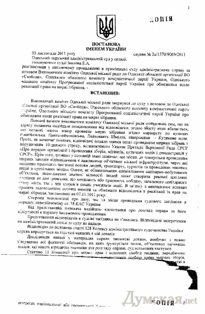 Не знаю, кому мешает шествие тех для кого ноябрьский праздник просто ностальгия по тем временам, когда всякая бендеровская мразь еще не гуляла по нашим улицам, а тихо шипела у себя по схронам, боясь высунуть головы. А теперь у нас в стране правят суды! Это ж надо такое придумать какой то безграмотный судьишка может запросто отменить конституционное право людей. Но ничего, еще не вечер, как говорят в нашем городе, хотя и сильно загаженном всякими maksriterами, еще не вечер