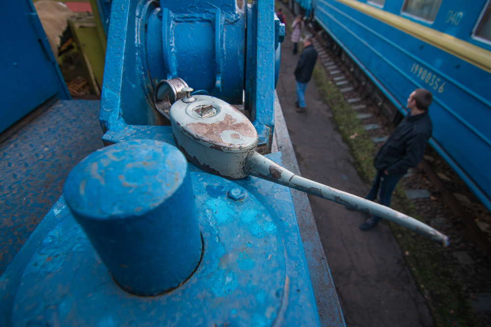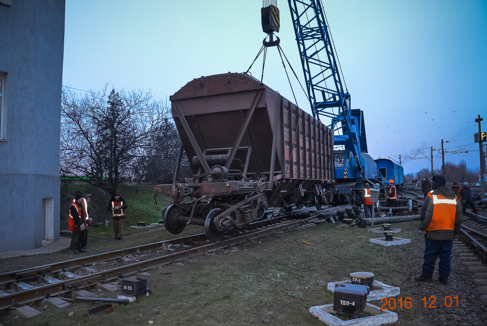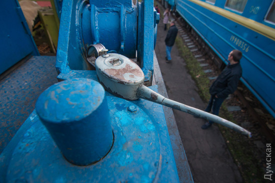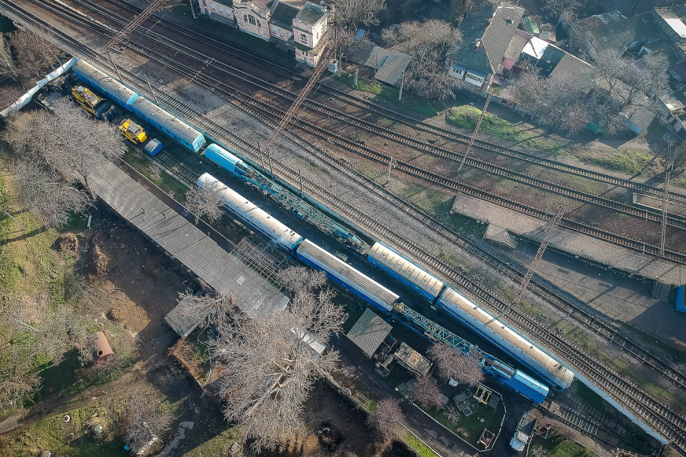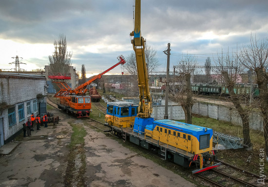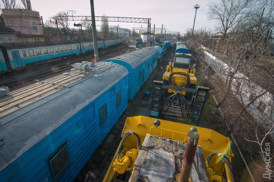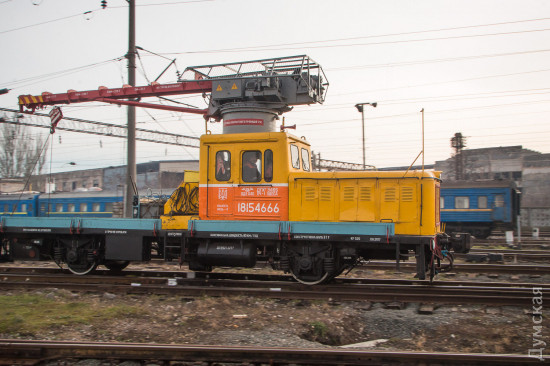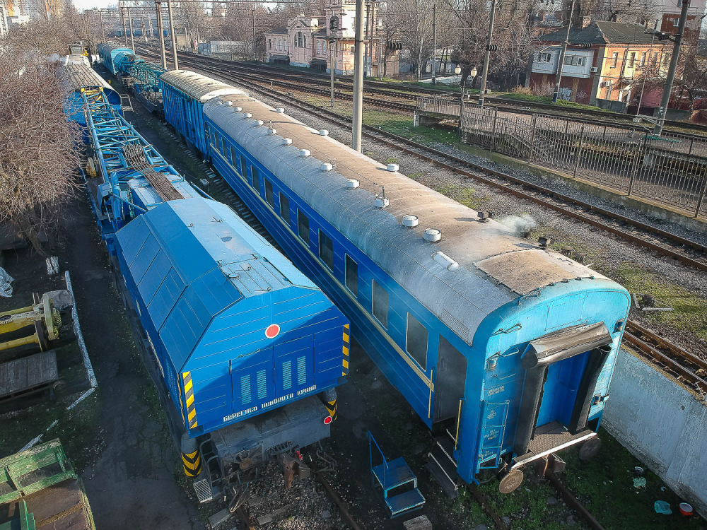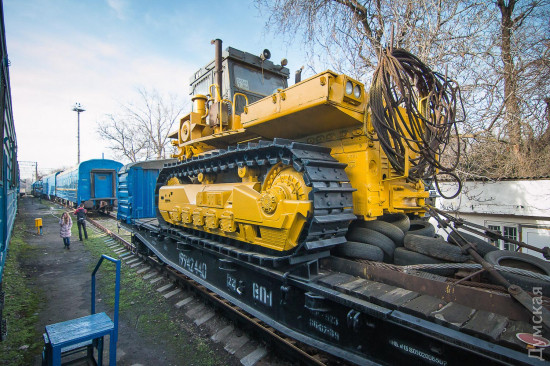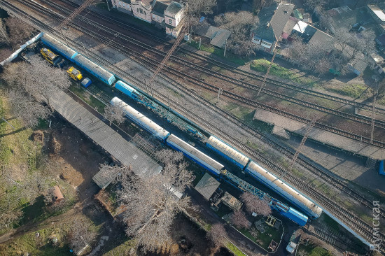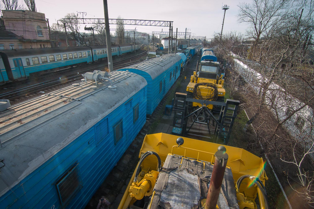 ОПТИМУС ПРАЙМ Если маленькие дрезины устраняют относительно небольшой ущерб, то в случае полного ЧП к месту происшествия выходит целый восстановительный поезд. Это самый большой из нашего списка спецпоездов. Великан, которого по праву можно назвать Оптимус Праймом железнодорожных трансформеров, состоит из 12 вагонов и платформ. Чтобы просто его сфотографировать, нам пришлось поднять в небо дрон. На Одесской железной дороге работает семь таких богатырей, обслуживающих разные участки. Один базируется на «Одессе-Товарной». Любопытно, что у всех восстановительных поездов есть свои клички-позывные. Восстановителей с Товарной коллеги называют «жориками». Начальник одесского восстановительного поезда Григорий Чередниченко с гордостью знакомит нас со своим хозяйством. «Вот новый бульдозер. Получили в 2011-м. Лебедка – 90 метров, а вытянуть может 60 тонн. Есть отвал, есть якорь», — рассказывает Григорий. Он наотрез отказался фотографироваться. Но несмотря на свою стеснительность, именно начальник восстановительного поезда отвечает за ликвидацию последствий аварий. А случаи бывали разные. Несколько лет назад одесский поезд был задействован в подъеме 12 вагонов грузового поезда, сошедших с рельс на железнодорожной станции Веселиново. В операции участвовали сразу четыре восстановительных поезда ОЖД. В будние дни восстановительному поезду дается всего 50 минут, чтобы выдвинуться к месту ЧП, в выходные — на десять минут больше. Прибыв на место аварии, «Оптимус Прайм» трансформируется: в зависимости от ситуации могут быть задействованы огромные краны, гидравлические подъемники или бульдозеры. Кранов два: ЕДК 500, грузоподъемностью 80 тонн, и ЕДК 1000/4, способный поднять сразу 125 тонн, то есть взрослого синего кита. На подъем одного вагона дается час, тепловоз должен встать на рельсы за полтора. В прошлом году пришлось поднимать вагон прямо в одесском порту: охранники зачем-то выкинули на пути буржуйку, из-за которой произошел сход. В 2015-м бульдозеры восстановительных поездов валили аварийные корпуса «Краяна», грозившие рухнуть на рельсы, по которым следуют пассажирские поезда. Есть у восстановителя и «мирные» функции, не связанные с чрезвычайными происшествиями и ситуациями. Как-то, например, он выгружал огромные емкости для Ильичевского масложиркомбината. В общем, его задействуют везде, где нужны мощные краны или бульдозеры, особенно в тех местах, куда не могут подобраться краны на автомобильном ходу.