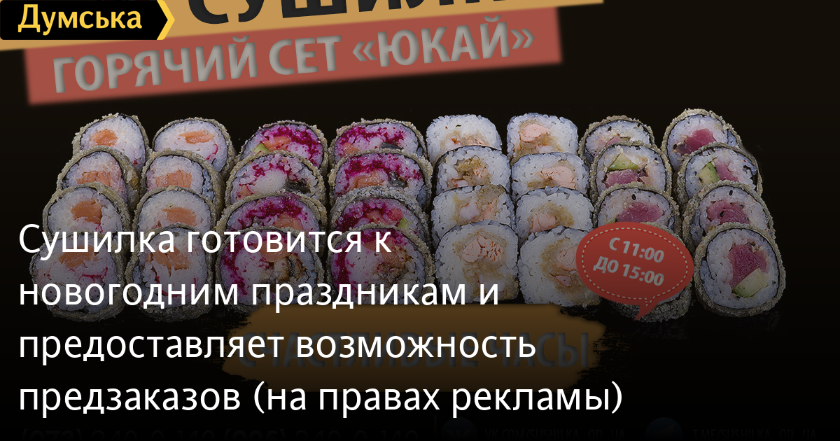 «Сушилка» готовится к новогодним праздникам и предоставляет возможность предзаказов (на правах рекламы)Доставка суши «Сушилка» готовится к новогодним праздникам и спешит сообщить, что уже открыта возможность совершить предварительный заказ на 19, 25 и 31 декабря. Отметим, что 31 декабря будет ограничен график приема заказов и работы. Кроме того, мы расширили область доставки. Отныне «Сушилка» обслуживает жителей жилмассива «7 небо» и поселка Мизикевича. На сайте можно ознакомиться подробно с ассортиментом и особенностями доставки. Заказ и предзаказ можно сделать как на сайте sushilka.od.ua, так и, позвонив по телефонам: 073-240-0-140 (Lifecell); 095-240-0-140 (Vodafone); 096-240-0-140 (Kyivstar); 048-735-29-99 (городской). СМЕРТЬ РОССИЙСКИМ ОККУПАНТАМ! Заметили ошибку? Выделяйте слова с ошибкой и нажимайте control-enter |