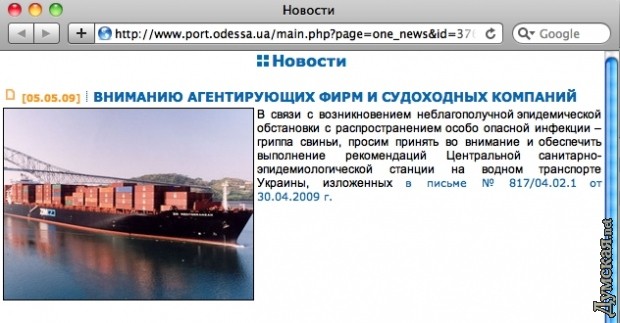 Посетителей официального сайта одесского морского торгового порта (ОМТП), на главной странице встречает обращение под названием «Вниманию агентирующих фирм и судоходных компаний», посвященное неблагоприятной эпидимиологической обстановке. Разумеется, свиным гриппом, в силу последних событий, никого не удивишь, но очень веселит сам текст этого обращения, которое мы приведем полностью: ![]() «ВНИМАНИЮ АГЕНТИРУЮЩИХ ФИРМ И СУДОХОДНЫХ КОМПАНИЙ Следует отметить, что это обращение висит на главной странице сайта уже несколько месяцев, и очень удивительно, что работники порта, видимо, так до сих пор и не узнали, как же на самом деле называется калифорнийский грипп АH1N1, иначе называемый свиным гриппом. СМЕРТЬ РОССИЙСКИМ ОККУПАНТАМ! Заметили ошибку? Выделяйте слова с ошибкой и нажимайте control-enter |