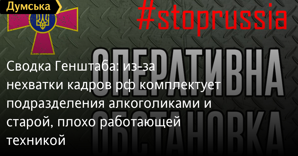 Сводка Генштаба: из-за нехватки кадров рф комплектует подразделения алкоголиками и старой, плохо работающей техникойС начала 31 суток героического противостояния Украинского народа русскому военному вторжению на отдельных направлениях враг не оставляет попыток ведения штурмовых действий, совершает авианалеты и пытается нанести огненное поражение отдельным подразделениям Вооруженных Сил Украины, но безуспешно. Как сообщается в утренней сводке Генштаба, оккупанты продолжают принимать меры с целью восстановления боеспособности своих подразделений, пополнения боеприпасов и горюче-смазочных материалов с целью подготовки к возобновлению наступательных действий. Вследствие нехватки квалифицированных кадров, противник осуществляет комплектование подразделений личным составом с низкими моральными качествами и лицами склонными к злоупотреблению наркотическими веществами и алкоголем. Враг осуществил развертывание практически всех подразделений росгвардии, которые дислоцировались на временно оккупированной территории АР Крым и отдельных районах Херсонской, Запорожской и Донецкой областей, с целью подавления сопротивления жителей Херсона, Геническа, Бердянска и в отдельных районах города Мариуполя. Оккупанты пытаются активизировать деятельность диверсионно-разведывательных групп на территории Киева с целью дестабилизации общественно-политической обстановки, нарушения системы государственного и военного управления. Это объясняется неспособностью быстро восполнить потери, осуществить надлежащую перегруппировку и применить войска для поддержки необходимого темпа ведения боевых действий и достижения конечной цели войны. С учетом высокого уровня безвозвратных и санитарных потерь и вовлечения в боевые действия военнослужащих срочной службы, проведение весенней призывной кампании 2022 года в рф, которая начинается 1 апреля, может стать проблемной. К тому же, просматривается тенденция резкого снижения количества контрактников по отношению к срочной службе. Таким образом, ухудшение социальной составляющей в результате международных санкций и потери в ходе войны в ближайшие недели, вероятно, обострят проблему комплектования российского войска качественным персоналом. Кроме того, техника поступающая из складов хранения и арсеналов в оккупационные подразделения, пытающиеся восстановить боеспособность, находится в неудовлетворительном техническом состоянии вследствие небрежной предварительной эксплуатации и длительного хранения. Группировка сил обороны продолжает вести оборонную операцию на определенных направлениях, проводит стабилизационную операцию, выполняет задачи территориальной обороны. Так, группировка сил и средств обороны Киева продолжает отражать наступление противника, наносить ему огневое поражение и удерживать ранее определенные оборонные рубежи. На Донецком и Луганском направлениях группировкой Объединенных сил отражены все вражеские атаки и нанесены существенные потери российским захватчикам. Украинскими воинами уничтожены восемь танков, 17 единиц бронированной и 11 единиц автомобильной техники противника. Потери захватчиков в живой силе составили около 170 человек. Подразделениями противовоздушной обороны сбиты три самолета и три БПЛА врага. Группировка Воздушных Си