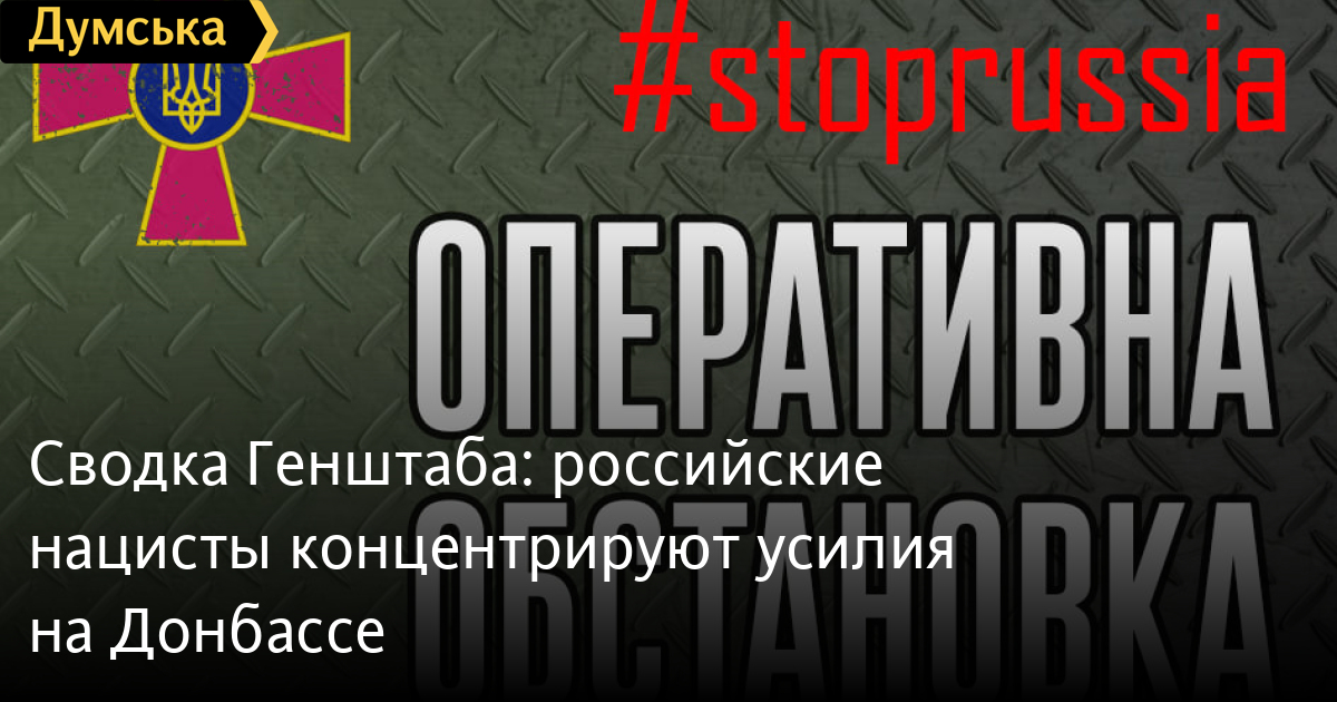 Генеральный штаб Вооруженных сил Украины опубликовал оперативную сводку по состоянию на 12:00. Сообщается, что противник концентрирует усилия на удержании захваченных рубежей и подготовке к возобновлению наступательных действий, в первую очередь в Донецкой и Луганской областях. Продолжается переброска российских подразделений на территорию Украины. Так, планируется отправка военной техники и 150 военнослужащих из состава 155-й отдельной бригады морской пехоты Тихоокеанского флота (Владивосток). Сформировано подразделение 14-й отдельной бригады спецназа Восточного военного округа (Хабаровск), которые будут готовы отправиться на войну в мае. На волынском направлении четыре БТГ из состава белорусской армии прибыли для усиления границы с Украиной. Сейчас вероятность участия белорусских частей в войне полностью не исключается. На полесском направлении противник активных наступательных действий не предпринимает, продолжает обстрелы наших войск у населенных пунктов Личанка, Петрушки, Шпитьки и Мощун. В Гомельской области Беларуси фиксируется передвижение пусковых установок оперативно-тактических ракетных комплексов «Искандер-М» к украинской границе. На северском направлении оккупанты из состава Центрального военного округа ВС РФ наступательных действий не проводят, укрепляют ранее занятые позиции и рассредоточивают технику по населенным пунктам и лесам. Продолжается блокада Чернигова, где российские нацисты продолжают наносить удары по объектам гражданской инфраструктуры. По имеющимся данным, враги ушли из населенного пункта Сновск и подорвали мост через реку Снов. Кроме того, захватчики уничтожили мосты в районах Конотопа, Старой Рудни, Смяча, сел Малый и Большой Дырчин. В направлении города Бровары оккупанты пытаются действовать силами отдельных подразделений 90-й танковой дивизии и 2-й общевойсковой армии ЦВО. В результате оборонительных действий враг был отброшен. Оккупанты продолжают обстреливать наши войска в районе села Лукьяновка. На слобожанском направлении противник действует силами отдельных подразделений из состава Западного военного округа. В районе Сум активных боев не происходит, оккупанты перегруппировываются и укрепляют позиции. Моральное состояние врага крайне низкое, солдаты из 15-го мотострелкового полка отказываются продолжать воевать. В направлении Харькова враг продолжает блокировать город, продолжает наносить удары по объектам гражданской инфраструктуры. В районе города Изюм действую подразделения из состава 20-й общевойсковой и 1-й танковой армий, а также Балтийского флота. Они перегруппировываются для дальнейшего продвижения к Славянску. На донецком направлении противники сосредотачивают усилия с целью захвата Попасной и Рубежного, а также Угледара и поселка Сладкое. Продолжаются бои за Мариуполь. Российские захватчики обстреливают из минометов Торецкое, Светлодарск, Троицкое и Пески. В районе населенного пункта Терни во время боя противник был отброшен украинскими силами обороны в район Макеевки. В Рубежном оккупанты пытаются под прикрытием артиллерии закрепится в северо-западной части города, несут потери, успеха не достигли. Вблизи села Нью-Йорк враг дважды безуспешно пытался пойти на штурм, вынужден отступить и ведет артобстрел украинских позиций. В районе Марьинки 