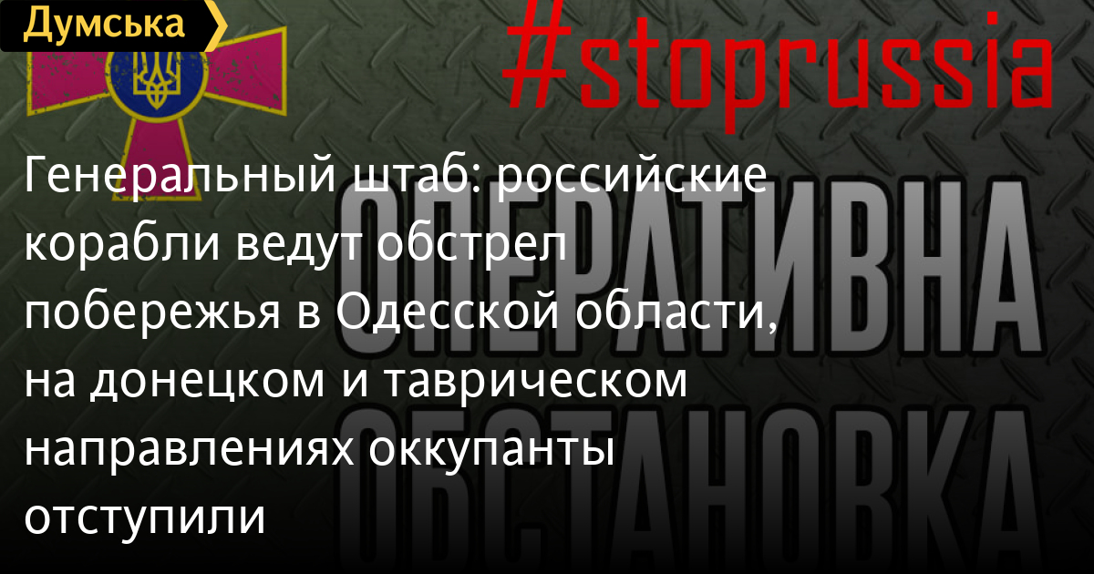 Генеральный штаб: российские корабли ведут обстрел побережья в Одесской области, на донецком и таврическом направлениях оккупанты отступилиПродолжаются 21 сутки героического противостояния украинского народа полномасштабному вторжению нацистской России. Генеральный штаб Вооруженных сил Украины обнародовал очередную сводку о ситуации на фронтах по состоянию на 12:00. Российские оккупационные войска продолжают стратегическую наступательную операцию против Украины. Задачи по разгрому группировок ВС Украины, выходу на административные границы Донецкой и Луганской областей Украины и установлению контроля над левобережной частью Украины не выполнены. Частично противник достиг цели на донецком направлении, но был остановлен на николаевском. Враг пытается осуществить перемещение дополнительных резервов Восточного военного округа. В связи со значительными потерями на южном направлении командование вооруженных сил страны-агрессора отказалось от усиления группировки войск на Полесье дополнительными резервными подразделениями из состава 5-й общевойсковой армии. На волынском направлении противник наступательных действий не проводил. Отмечено ведение воздушной разведки с использованием БПЛА «Орлан-10». В вооруженных силах Республики Беларусь запланировано проведение ротации подразделений, которые выполняют задание по прикрытию белорусско-украинского участка границы. Враг предпринимает попытки возобновления наступательных действий в направлении Вышгорода. В течение суток он пытался продвинуться в сторону Киева. Успеха не имел, перешел к обороне. На северском направления противник остановлен. Оккупанты пытаются закрепиться на достигнутых рубежах, осуществляют перегруппировку войск и предпринимают попытки восстановить боеспособность своих подразделений. Враг не оставляет надежды овладеть Черниговом, но активных наступательных действий не проводит, занимается перегруппировкой войск и пытается организовать логистическое обеспечение, успеха не имеет. В направлении на Бровары наблюдается перемещение малочисленных групп техники оккупантов в границах занятого района населенных пунктов Богдановка и Великая Дымерка. На слобожанском направлении оккупанты пытаются закрепиться на захваченных рубежах, осуществляют перегруппировку войск, пополняют запасы боеприпасов и горюче-смазочных материалов. Продолжается блокирование противником Сум, Лебедина и Охтырки. Активных наступательных действий враг не проводит. Также российские нацисты продолжают предпринимать неудачные попытки блокирования Харькова. На донецком и таврическом направлениях в результате штурмовых действий в районе Попасной противник понес потери и был вынужден отойти для перегруппировки. В районе Северодонецка оккупанты провели разведку боем, успеха не имели, пытаются закрепиться на восточных и западных окраинах Рубежного. При этом, по имеющейся информации, 15 марта армейская авиация противника нанесла огневое поражение по позициям своих войск возле населенного пункта Смоляниново. На волновашском направлении оккупанты пытаются развить наступление в направлении населенного пункта Великая Новоселка. На криворожском направлении враг предпринимает попытки возобновить наступление в направлении Великой Костромы, Малой Костромы и Кр