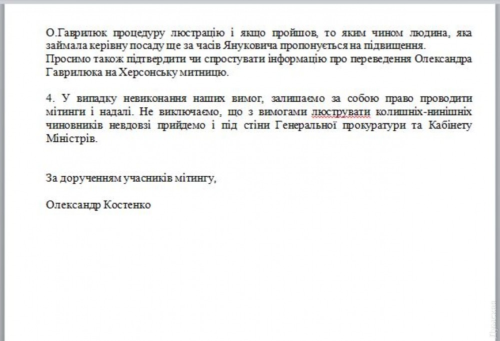 Активисты добиваются люстрации одесского таможенника Гаврилюка, который успешно трудился при ЯнуковичеОбщественные активисты встретились с представителями Государственной фискальной службы и официально передали свои требования относительно люстрации на таможне. Отметим, именно с такими лозунгами в начале недели прошел митинг под стенами ГФС. Активисты выступили за очистку нынешней власти от сторонников бывшего президента Януковича. В своей резолюции таможенные брокеры, предприниматели и общественные активисты требовали сообщить им о результатах люстрации на таможне, а также о том, сколько уголовных дел было открыто по фактам коррупции на таможне, и какие кадровые решения по этим фактам приняты руководством таможни. Отдельным вопросом в резолюции был перевод одного из руководителей таможенного поста в Одесской области Александра Гаврилюка на повышение в Херсонскую область. Активисты отмечают, что этот чиновник работал еще во времена Януковича, но каким-то образом успешно прошел процедуру люстрации. «Его давно должны были люстрировать, а взамен Гаврилюк получает переход на другое не менее денежное место», — возмущены общественники. Во время встречи с митингующими представители ГФС пообещали рассмотреть данные вопросы. «Мы встретились с представителями ГФС, передали им свои требования и попросили в определенный срок дать четкие ответы на наши вопросы. Они пообещали все рассмотреть. Если мы не получим этих ответов, мы снова придем под стены фискальной службы и будем протестовать уже бессрочно», — отметил активист общественной организации «Ресурсный центр инициатив громады» Александр Костенко. СМЕРТЬ РОСІЙСЬКИМ ОКУПАНТАМ! Помітили помилку? Виділяйте слова з помилкою та натискайте control-enter |