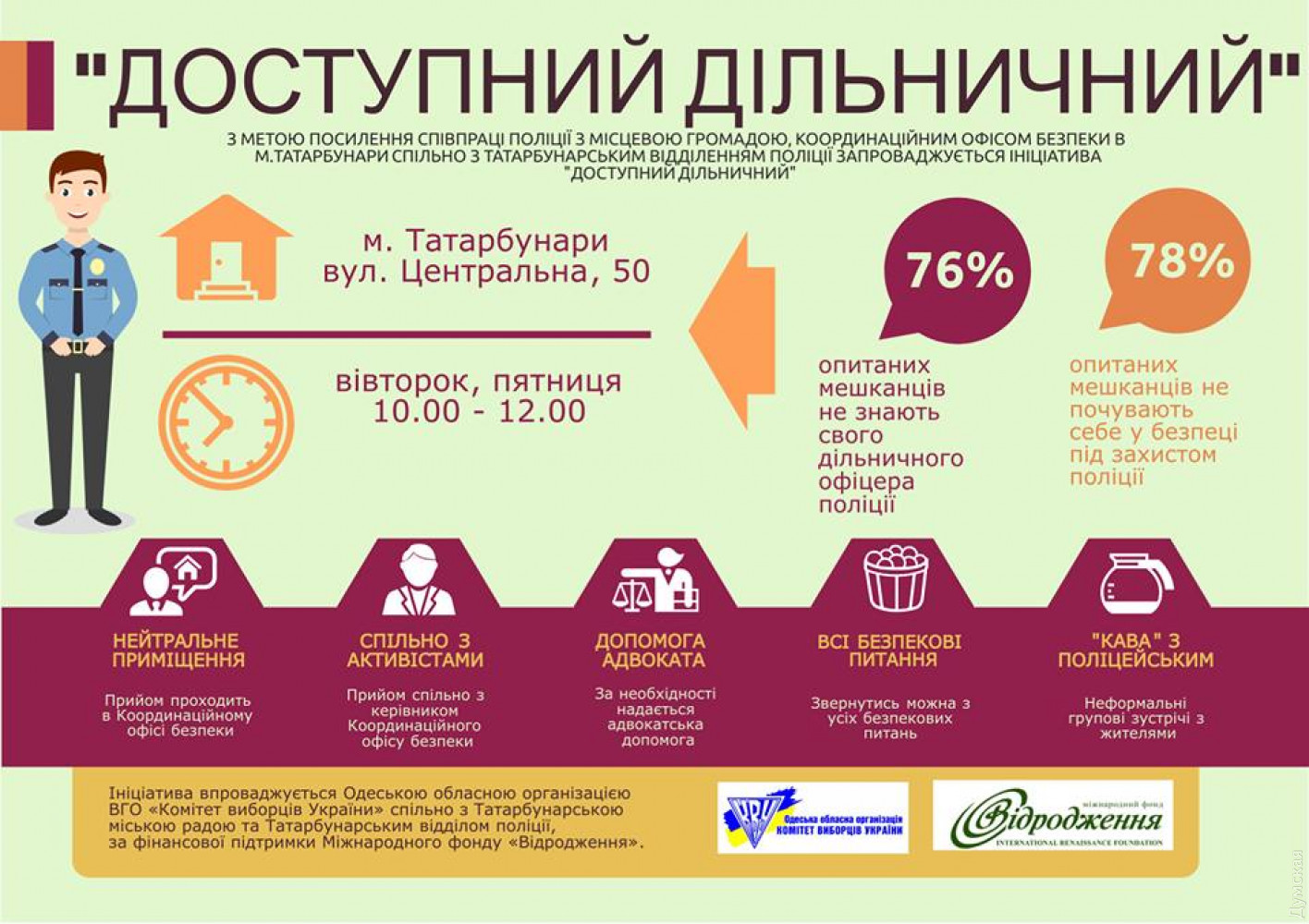 Одесская областная организация «Комитет избирателей Украины» приняла участие в программе «Доступный участковый» и за свой счет напечатала визитки для всех участковых Татарбунарского района. Как сообщил руководитель облКИУ Анатолий Бойко, в Татарбунарах внедряют новый для Украины формат обеспечения безопасности в громаде. «В рамках этого «пилота» создан координационный офис безопасности. Исследование, проведенное этим офисом, показало, что 76 % опрошенных жителей не знают своего участкового. Кстати, я тоже своего не знаю, а все потому, что у него визиток нет, а у татарбунарских участковых теперь будут», — заявил Анатолий Бойко. Кроме того, в рамках программы «Доступный участковый» участковые планируют распивать кофе в неформальных встречах с гражданами ради налаживания доверительных отношений и обсуждения их проблем. СМЕРТЬ РОСІЙСЬКИМ ОКУПАНТАМ! Помітили помилку? Виділяйте слова з помилкою та натискайте control-enter |