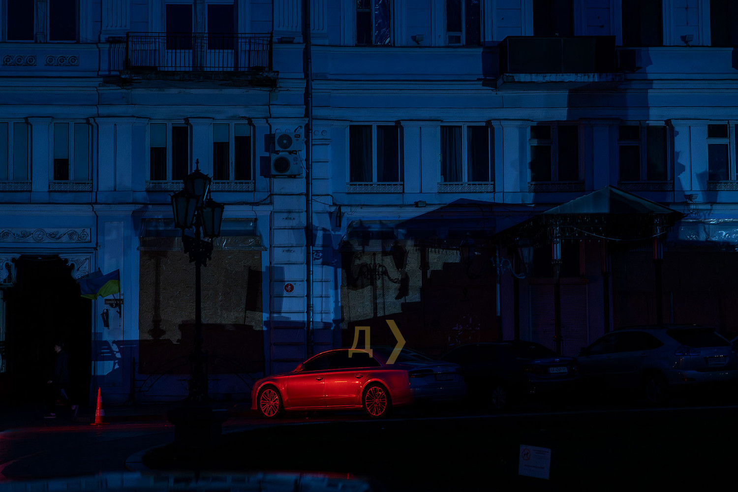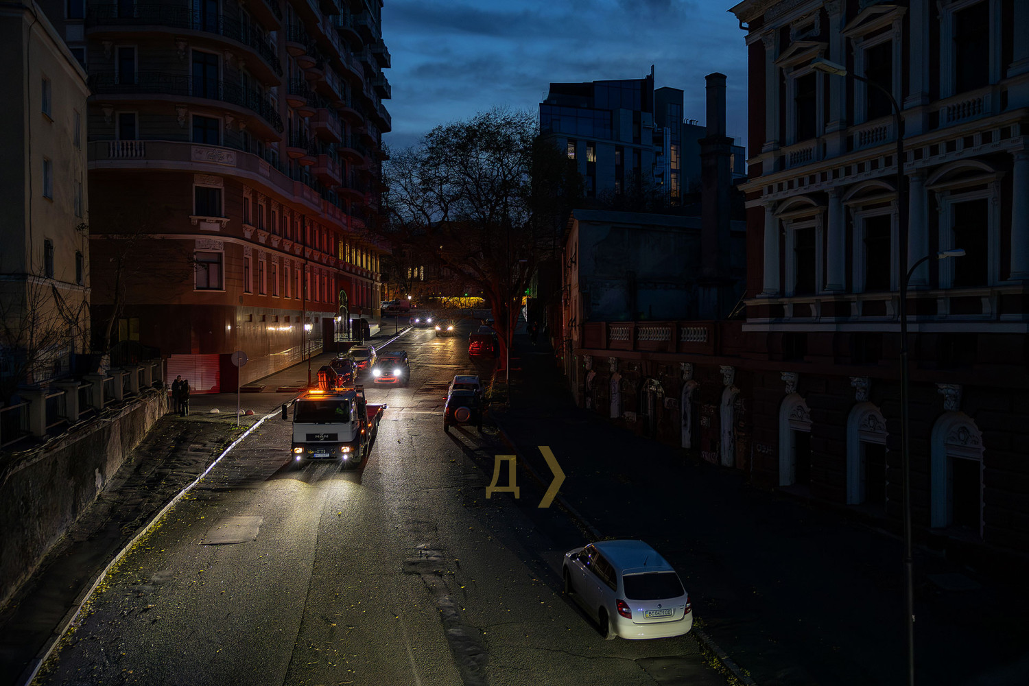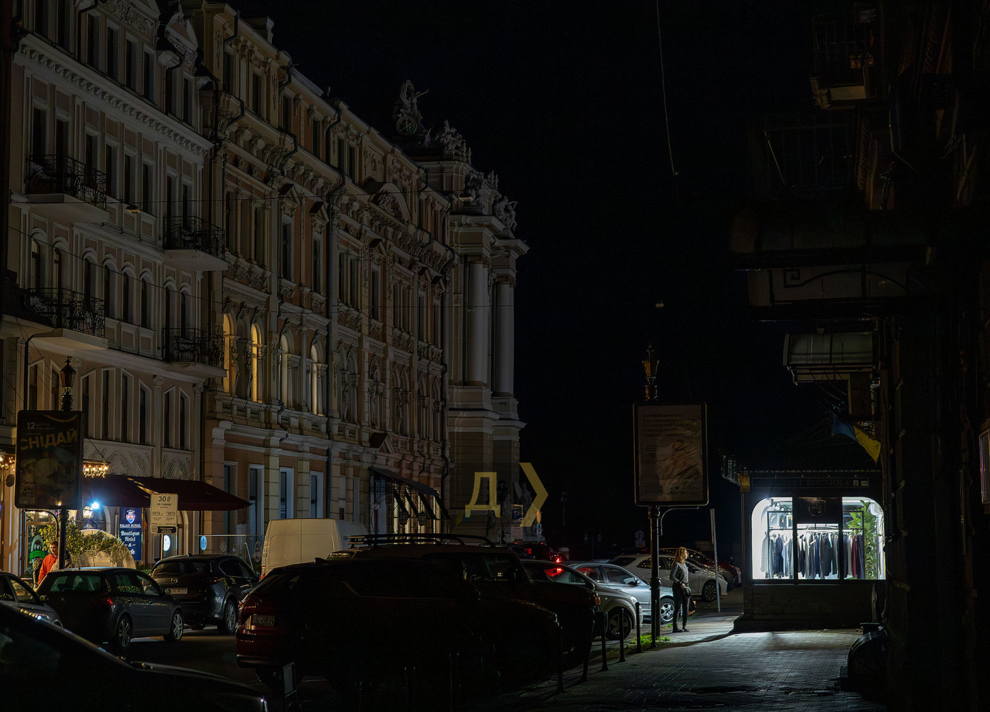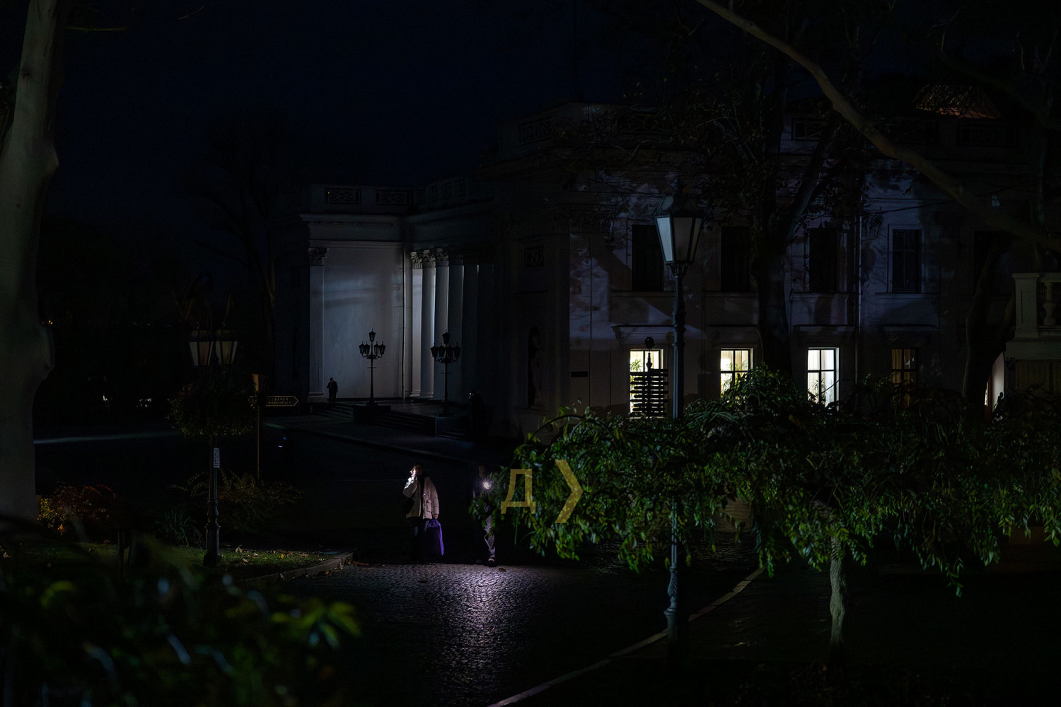 Приморський бульвар, і все, що під ним, занурені в безпросвітну темряву. Навіть будинок мерії зустрічає одеситів лише парою освітлених вікон, а єдина яскрава пляма на Біржовому майдані — це червоний стоп-сигнал самокату. Однак відчуття повного блекауту немає. Повітря наповнене життєстверджуючим гуркотом генераторів. Енергія палива, що спалюється в них, зазнавши низки перетворень у різних побутових приладах, зігріває одеситів міцною кавою, соковитим бургером, заспокоює мелодіями з динаміків і картинками з екранів, розганяє морок теплим світлом ліхтарів. Приватний бізнес адаптувався: працюють ресторани, кав'ярні, книгарні. Місто живе. З цілком зрозумілих причин пішоходів на вулицях поменшало, але назвати центр пустельним не можна. Одесити пересуваються з ліхтариками або ввімкнувши підсвічування смартфонів. Як метелики, вони концентруються біля найяскравіших закладів. Домашні вихованці у світлодіодних нашийниках, немов світлячки, пурхають над блискучою бруківкою бруківкою. Вже завтра ранкове сонце розжене морок, а енергетики продовжать робити неможливе, повертаючи до будинків одеситів світло.