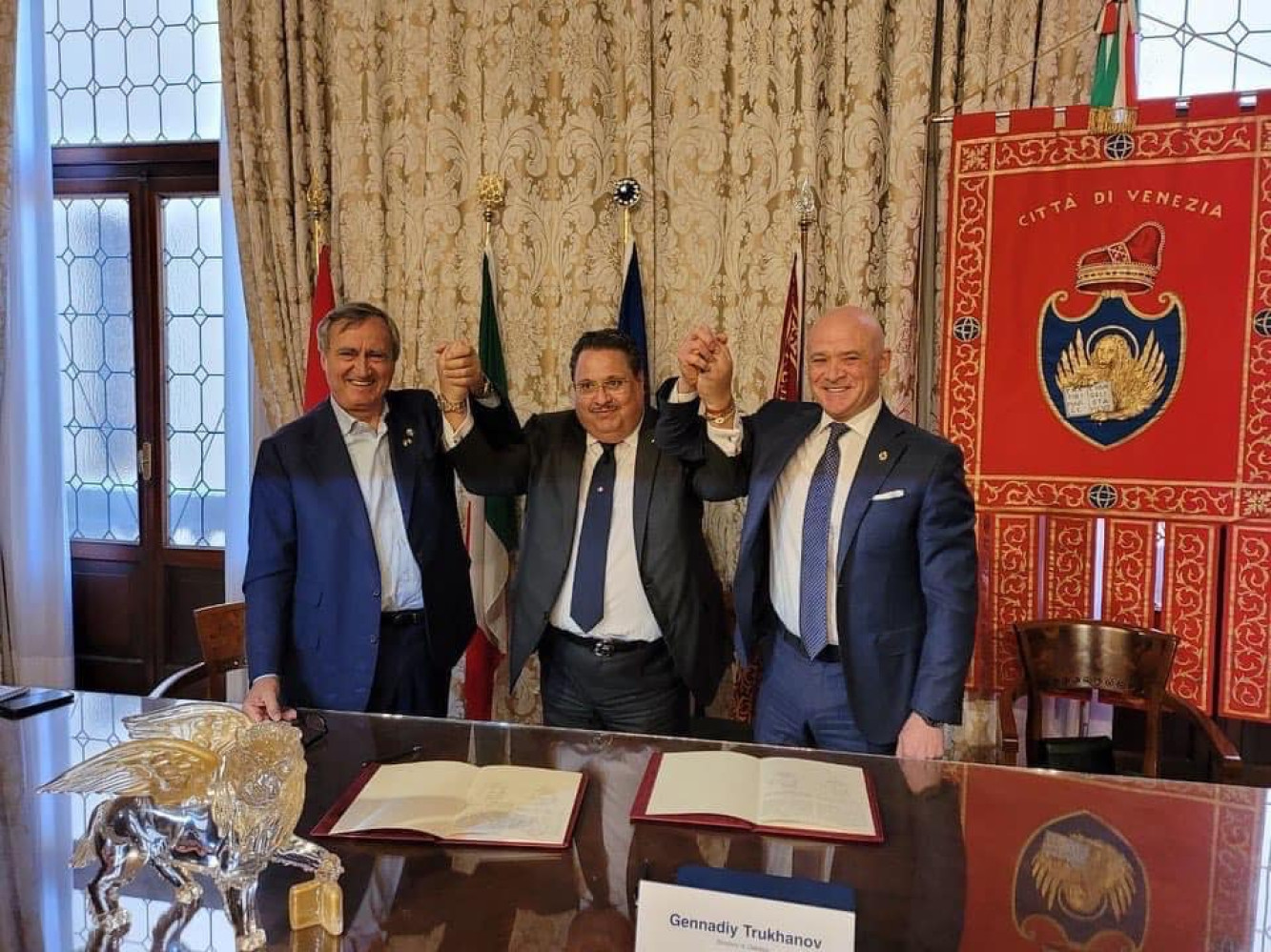 Тепер офіційно: мери Одеси та Венеції підписали договір про побратимство (офіційно, фото, відео)Одеса і Венеція офіційно узаконили свої відносини — мери міст Геннадій Труханов і Луїджі Бруньяро скріпили угоди про побратимські відносини своїми підписами. На честь цієї знакової події міські голови обмінялися пам'ятними подарунками. Геннадію Труханову дісталася фігурка крилатого лева, що прикрашає герб італійського міста, яку він продемонстрував сьогодні на засіданні виконавчого комітету. Під час підписання договору мер Одеси подякував італійському народу за підтримку України на різних фронтах: військовому, дипломатичному та культурному. «Це була ініціатива Венеції. Дуже приємно, що таке відоме на весь світ місто проявило ініціативу, за що я вдячний меру Луїджі Бруньяро і всім венеціанцям», — додав мер. Труханов наголосив, що під час зустрічей із мером Венеції та мером Риму паном Роберто Гвалтьєрі Одеса отримала підтримку у питанні прийняття історичного центру міста до основного списку Всесвітьної спадщини ЮНЕСКО. За словами одеського віцемера Павла Вугельмана, офіційне підписання угоди про побратимські відносини — великий крок для нашого міста. «Венеція — один із туристичних центрів світу і побратимство між нашими містами відкриває ще більші можливості для розвитку туристичної Одеси та зміцнення культурних зв'язків між містами і країнами», — заявив Вугельман. Віцемер підкреслив, що у Венеції відбувається бієнале 2022. Разом із радником мера Аттіліо Малліані наша делегація відвідала український павільйон, організований трьома українськими художниками. Piazza Ukraine — це інсталяція, розроблена архітектором Даною Косьміною та встановлена в просторі Esedra в садах Biennale. «Мета цього проєкту – дати можливість висловитися митцям та мистецькій спільноті України та допомогти побудувати глибокий діалог. Засипаний мішками з піском пам’ятник (як наші пам’ятники в Одесі) нагадує про поширену практику захисту публічного мистецтва під час бомбардувань», — розповів пан Малліані. СМЕРТЬ РОСІЙСЬКИМ ОКУПАНТАМ! Помітили помилку? Виділяйте слова з помилкою та натискайте control-enter |