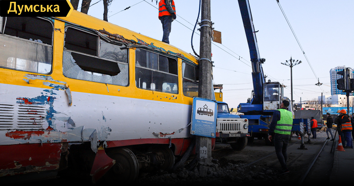 На Толбухина, у «МакДональдса», трамвай 13-го маршрута сошел с рельсов и повредил стоящую рядом опору линии электропередач.