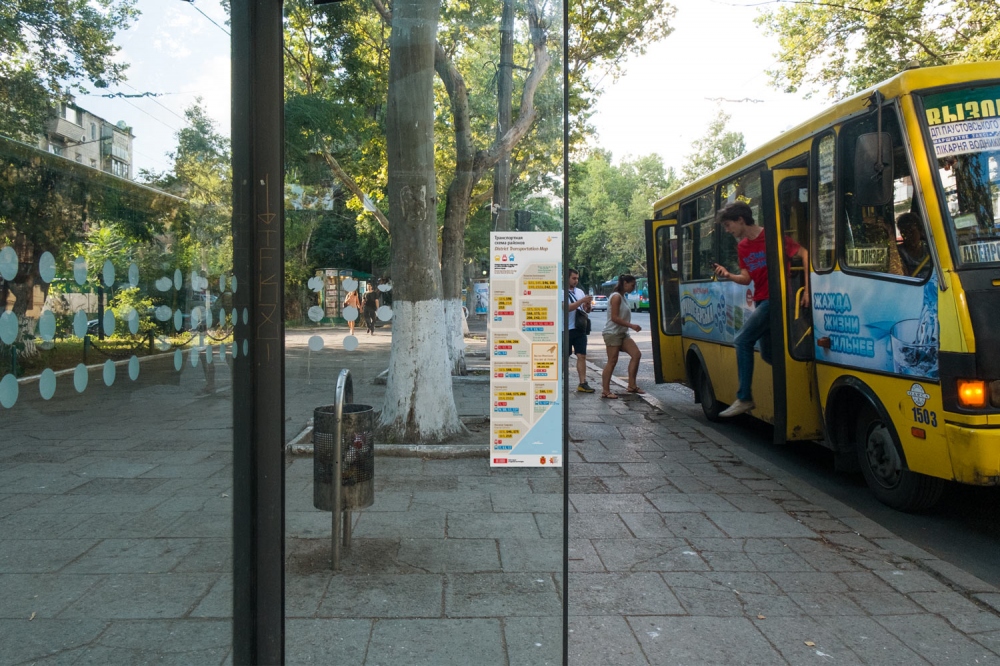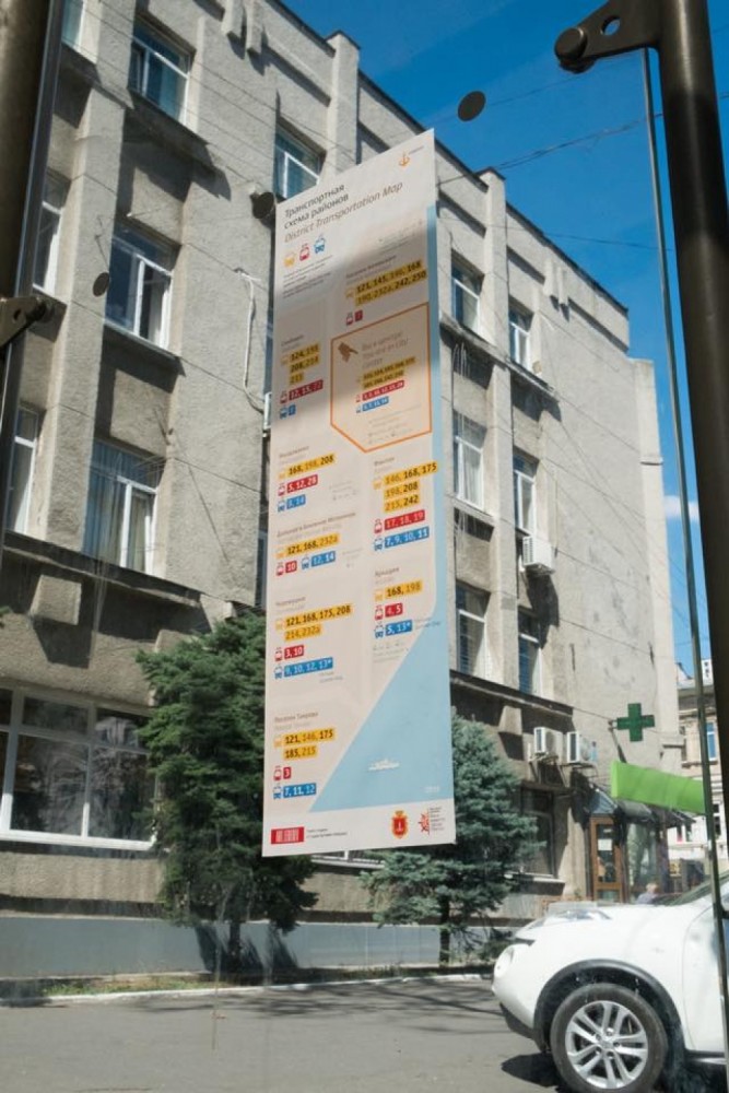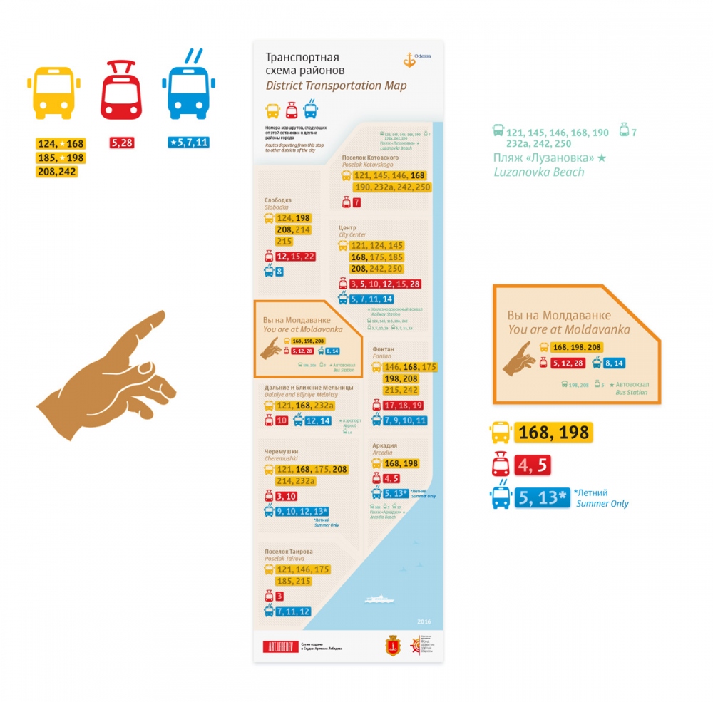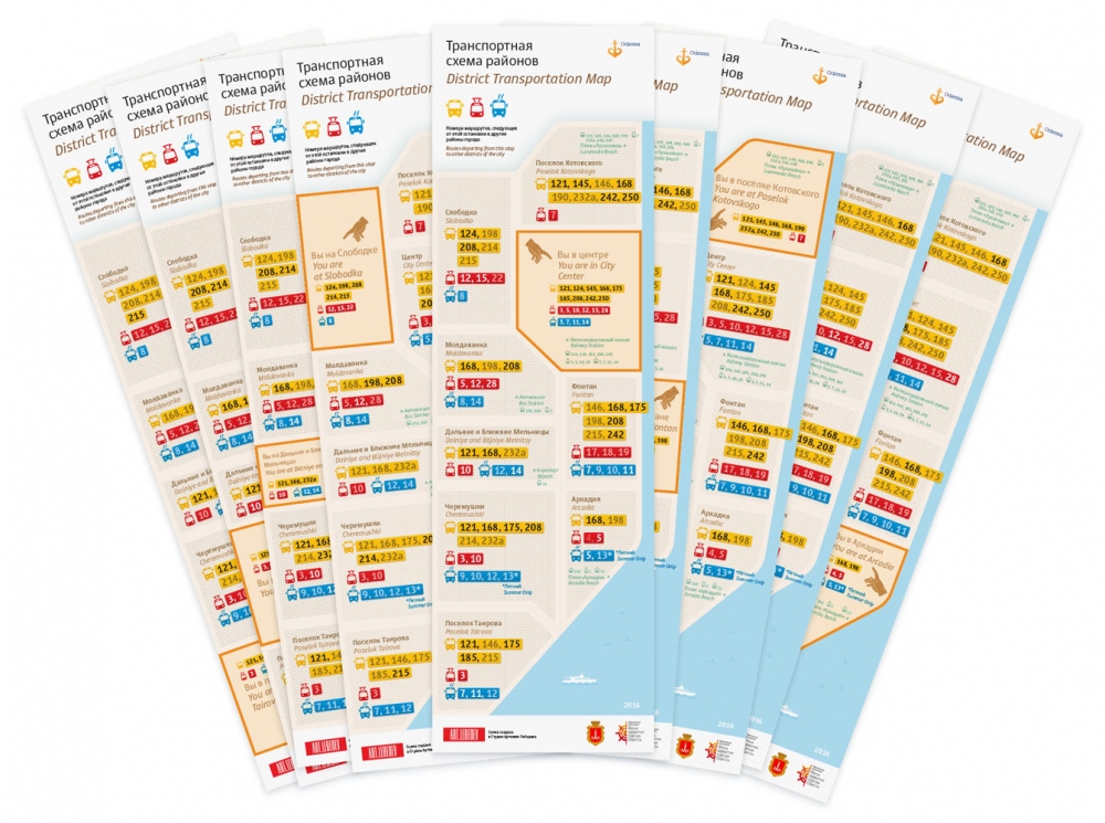 На одесских остановках появились новые схемы движения общественного транспорта, разработанные участниками одесского дизайн-практикума под художественным руководством Артемия Лебедева. «Простая и понятная схема наглядно показывает, в какие районы следуют основные транспортные маршруты. Отсутствие точной географии и детализации классических схем позволяет быстрее сориентироваться, запомнить расположение районов и спланировать путь. Номера маршрутов подобраны таким образом, чтобы они пересекали несколько районов, а транслитерация помогает иностранным гостям города выбрать верное направление», — отмечают авторы.