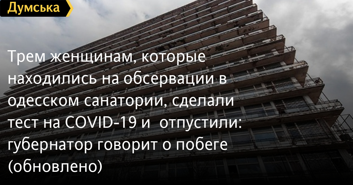 Трем женщинам, которые находились на обсервации в одесском санатории, сделали тест на COVID-19 и отпустили: губернатор говорит о побеге (обновлено)Странная история произошла с украинскими гражданами, которые после возвращения из-за границы находятся на обсервации в одесском санатории имени Пирогова на Куяльнике. Как рассказали они «Думской», на следующий день после поселения всем сделали экспресс-тест на коронавирус. У трех женщин он дал положительный результат. Вечером за ними приехала скорая и доставила с вещами в одесскую инфекционку. Утром им сделали еще один тест (тоже экспресс, не ПЦР), но не оставили в лечебном учреждении, а, взяв расписку о самоизоляции, отвезли к Двум столбам, где отпустили, предложив добираться до санатория самостоятельно. Одна из женщин плюнула на все, взяла такси и уехала домой, в Киев. Случившееся возмутило остальных людей, которые находятся на обсервации в санатории: почему, мол, здоровых держат взаперти, а с подозрением на вирус отпускают? В ответ на это губернатор Максим Куцый заявил, что пациентка сбежала из инфекционки. ОБНОВЛЕНО В 16:40. В пресс-службе мэрии опровергли информацию главы ОГА о побеге: «По трем гражданам, доставленным в инфекционную больницу из обсервации на Куяльнике. Два пациента лежат в инфекционной больнице. У третьей, которая якобы сбежала, были сделаны быстрый тест и ПЦР-тест, которые дали отрицательные результаты». СМЕРТЬ РОСІЙСЬКИМ ОКУПАНТАМ! Помітили помилку? Виділяйте слова з помилкою та натискайте control-enter